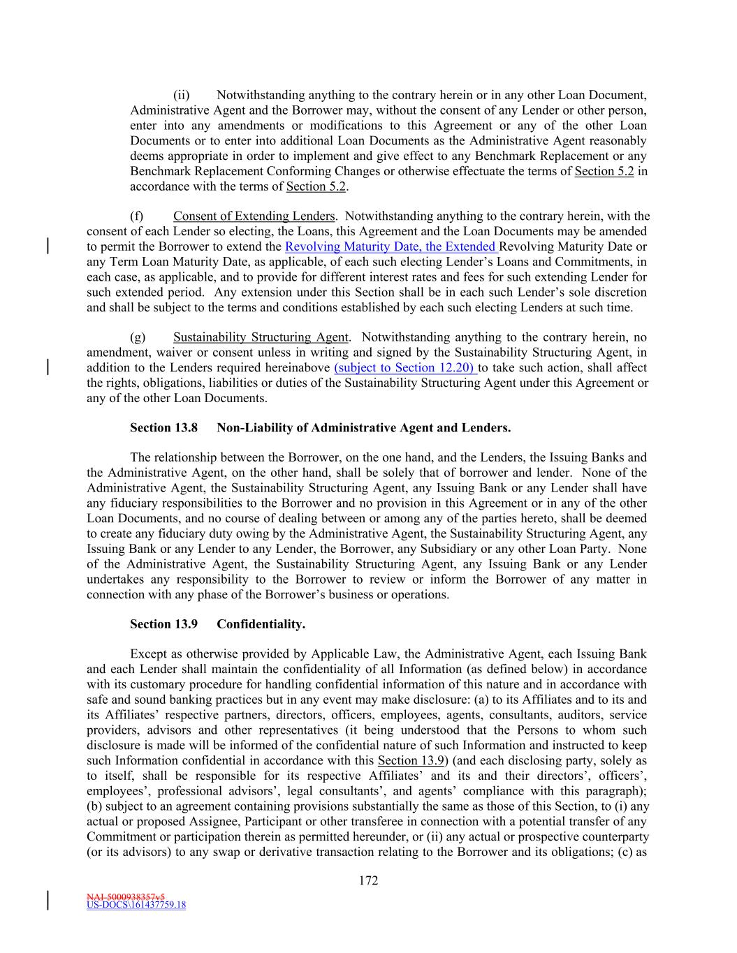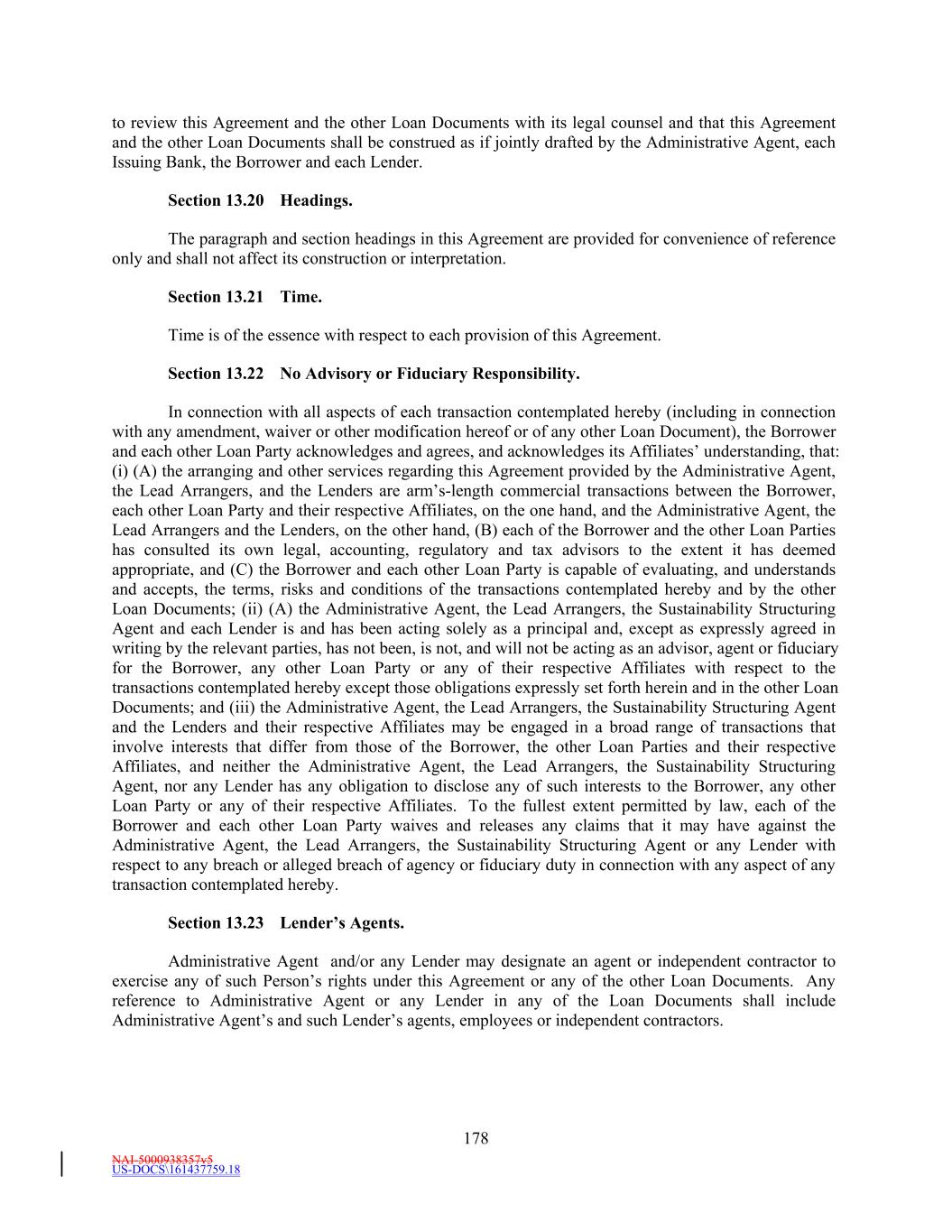 NAI-5000938357v5 US-DOCS\161437759.18 178 to review this Agreement and the other Loan Documents with its legal counsel and that this Agreement and the other Loan Documents shall be construed as if jointly drafted by the Administrative Agent, each Issuing Bank, the Borrower and each Lender. Section 13.20 Headings. The paragraph and section headings in this Agreement are provided for convenience of reference only and shall not affect its construction or interpretation. Section 13.21 Time. Time is of the essence with respect to each provision of this Agreement. Section 13.22 No Advisory or Fiduciary Responsibility. In connection with all aspects of each transaction contemplated hereby (including in connection with any amendment, waiver or other modification hereof or of any other Loan Document), the Borrower and each other Loan Party acknowledges and agrees, and acknowledges its Affiliates’ understanding, that: (i) (A) the arranging and other services regarding this Agreement provided by the Administrative Agent, the Lead Arrangers, and the Lenders are arm’s-length commercial transactions between the Borrower, each other Loan Party and their respective Affiliates, on the one hand, and the Administrative Agent, the Lead Arrangers and the Lenders, on the other hand, (B) each of the Borrower and the other Loan Parties has consulted its own legal, accounting, regulatory and tax advisors to the extent it has deemed appropriate, and (C) the Borrower and each other Loan Party is capable of evaluating, and understands and accepts, the terms, risks and conditions of the transactions contemplated hereby and by the other Loan Documents; (ii) (A) the Administrative Agent, the Lead Arrangers, the Sustainability Structuring Agent and each Lender is and has been acting solely as a principal and, except as expressly agreed in writing by the relevant parties, has not been, is not, and will not be acting as an advisor, agent or fiduciary for the Borrower, any other Loan Party or any of their respective Affiliates with respect to the transactions contemplated hereby except those obligations expressly set forth herein and in the other Loan Documents; and (iii) the Administrative Agent, the Lead Arrangers, the Sustainability Structuring Agent and the Lenders and their respective Affiliates may be engaged in a broad range of transactions that involve interests that differ from those of the Borrower, the other Loan Parties and their respective Affiliates, and neither the Administrative Agent, the Lead Arrangers, the Sustainability Structuring Agent, nor any Lender has any obligation to disclose any of such interests to the Borrower, any other Loan Party or any of their respective Affiliates. To the fullest extent permitted by law, each of the Borrower and each other Loan Party waives and releases any claims that it may have against the Administrative Agent, the Lead Arrangers, the Sustainability Structuring Agent or any Lender with respect to any breach or alleged breach of agency or fiduciary duty in connection with any aspect of any transaction contemplated hereby. Section 13.23 Lender’s Agents. Administrative Agent and/or any Lender may designate an agent or independent contractor to exercise any of such Person’s rights under this Agreement or any of the other Loan Documents. Any reference to Administrative Agent or any Lender in any of the Loan Documents shall include Administrative Agent’s and such Lender’s agents, employees or independent contractors.