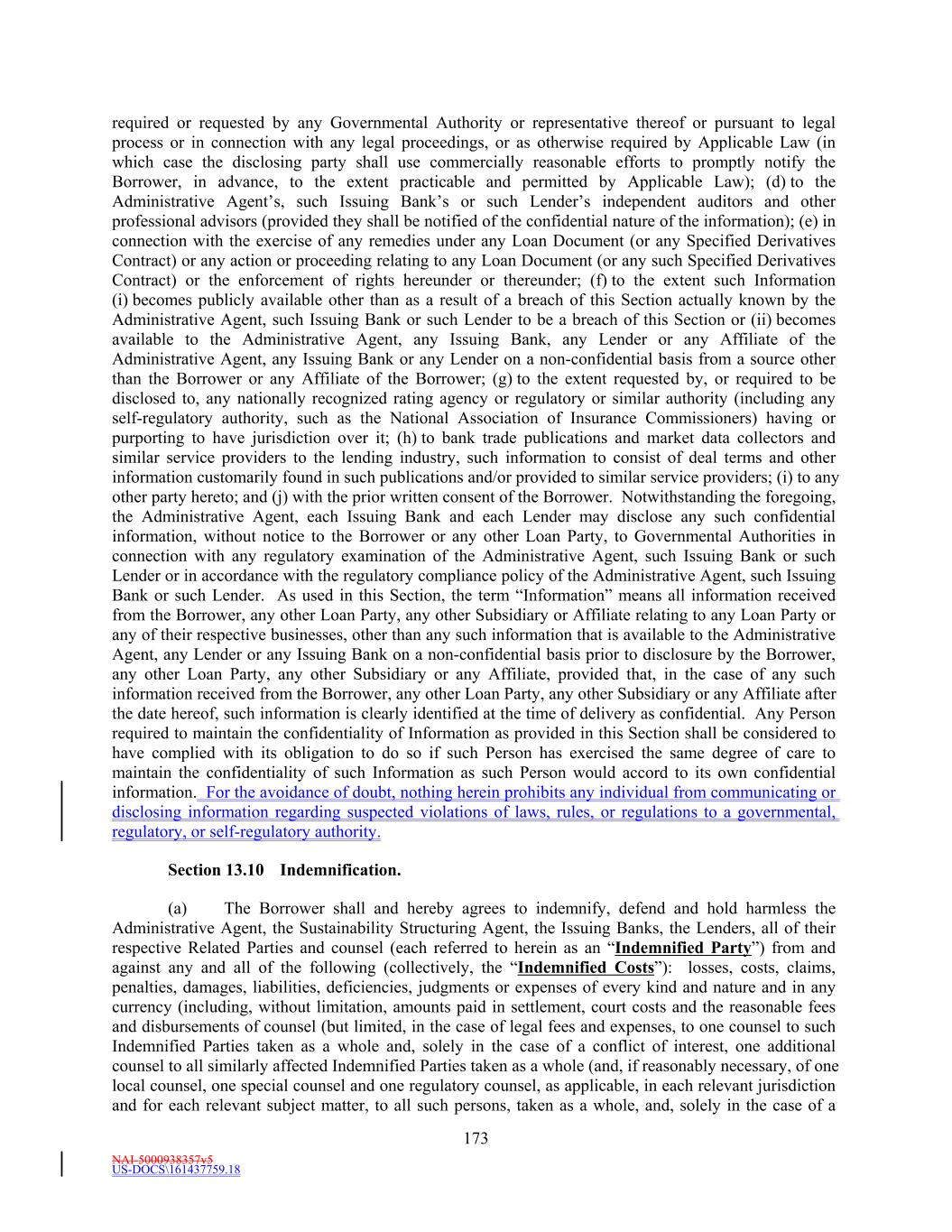 NAI-5000938357v5 US-DOCS\161437759.18 173 required or requested by any Governmental Authority or representative thereof or pursuant to legal process or in connection with any legal proceedings, or as otherwise required by Applicable Law (in which case the disclosing party shall use commercially reasonable efforts to promptly notify the Borrower, in advance, to the extent practicable and permitted by Applicable Law); (d) to the Administrative Agent’s, such Issuing Bank’s or such Lender’s independent auditors and other professional advisors (provided they shall be notified of the confidential nature of the information); (e) in connection with the exercise of any remedies under any Loan Document (or any Specified Derivatives Contract) or any action or proceeding relating to any Loan Document (or any such Specified Derivatives Contract) or the enforcement of rights hereunder or thereunder; (f) to the extent such Information (i) becomes publicly available other than as a result of a breach of this Section actually known by the Administrative Agent, such Issuing Bank or such Lender to be a breach of this Section or (ii) becomes available to the Administrative Agent, any Issuing Bank, any Lender or any Affiliate of the Administrative Agent, any Issuing Bank or any Lender on a non-confidential basis from a source other than the Borrower or any Affiliate of the Borrower; (g) to the extent requested by, or required to be disclosed to, any nationally recognized rating agency or regulatory or similar authority (including any self-regulatory authority, such as the National Association of Insurance Commissioners) having or purporting to have jurisdiction over it; (h) to bank trade publications and market data collectors and similar service providers to the lending industry, such information to consist of deal terms and other information customarily found in such publications and/or provided to similar service providers; (i) to any other party hereto; and (j) with the prior written consent of the Borrower. Notwithstanding the foregoing, the Administrative Agent, each Issuing Bank and each Lender may disclose any such confidential information, without notice to the Borrower or any other Loan Party, to Governmental Authorities in connection with any regulatory examination of the Administrative Agent, such Issuing Bank or such Lender or in accordance with the regulatory compliance policy of the Administrative Agent, such Issuing Bank or such Lender. As used in this Section, the term “Information” means all information received from the Borrower, any other Loan Party, any other Subsidiary or Affiliate relating to any Loan Party or any of their respective businesses, other than any such information that is available to the Administrative Agent, any Lender or any Issuing Bank on a non-confidential basis prior to disclosure by the Borrower, any other Loan Party, any other Subsidiary or any Affiliate, provided that, in the case of any such information received from the Borrower, any other Loan Party, any other Subsidiary or any Affiliate after the date hereof, such information is clearly identified at the time of delivery as confidential. Any Person required to maintain the confidentiality of Information as provided in this Section shall be considered to have complied with its obligation to do so if such Person has exercised the same degree of care to maintain the confidentiality of such Information as such Person would accord to its own confidential information. For the avoidance of doubt, nothing herein prohibits any individual from communicating or disclosing information regarding suspected violations of laws, rules, or regulations to a governmental, regulatory, or self-regulatory authority. Section 13.10 Indemnification. (a) The Borrower shall and hereby agrees to indemnify, defend and hold harmless the Administrative Agent, the Sustainability Structuring Agent, the Issuing Banks, the Lenders, all of their respective Related Parties and counsel (each referred to herein as an “Indemnified Party”) from and against any and all of the following (collectively, the “Indemnified Costs”): losses, costs, claims, penalties, damages, liabilities, deficiencies, judgments or expenses of every kind and nature and in any currency (including, without limitation, amounts paid in settlement, court costs and the reasonable fees and disbursements of counsel (but limited, in the case of legal fees and expenses, to one counsel to such Indemnified Parties taken as a whole and, solely in the case of a conflict of interest, one additional counsel to all similarly affected Indemnified Parties taken as a whole (and, if reasonably necessary, of one local counsel, one special counsel and one regulatory counsel, as applicable, in each relevant jurisdiction and for each relevant subject matter, to all such persons, taken as a whole, and, solely in the case of a