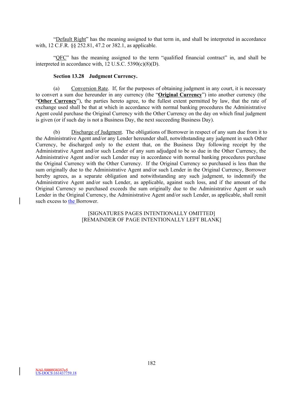NAI-5000938357v5 US-DOCS\161437759.18 182 “Default Right” has the meaning assigned to that term in, and shall be interpreted in accordance with, 12 C.F.R. §§ 252.81, 47.2 or 382.1, as applicable. “QFC” has the meaning assigned to the term “qualified financial contract” in, and shall be interpreted in accordance with, 12 U.S.C. 5390(c)(8)(D). Section 13.28 Judgment Currency. (a) Conversion Rate. If, for the purposes of obtaining judgment in any court, it is necessary to convert a sum due hereunder in any currency (the “Original Currency”) into another currency (the “Other Currency”), the parties hereto agree, to the fullest extent permitted by law, that the rate of exchange used shall be that at which in accordance with normal banking procedures the Administrative Agent could purchase the Original Currency with the Other Currency on the day on which final judgment is given (or if such day is not a Business Day, the next succeeding Business Day). (b) Discharge of Judgment. The obligations of Borrower in respect of any sum due from it to the Administrative Agent and/or any Lender hereunder shall, notwithstanding any judgment in such Other Currency, be discharged only to the extent that, on the Business Day following receipt by the Administrative Agent and/or such Lender of any sum adjudged to be so due in the Other Currency, the Administrative Agent and/or such Lender may in accordance with normal banking procedures purchase the Original Currency with the Other Currency. If the Original Currency so purchased is less than the sum originally due to the Administrative Agent and/or such Lender in the Original Currency, Borrower hereby agrees, as a separate obligation and notwithstanding any such judgment, to indemnify the Administrative Agent and/or such Lender, as applicable, against such loss, and if the amount of the Original Currency so purchased exceeds the sum originally due to the Administrative Agent or such Lender in the Original Currency, the Administrative Agent and/or such Lender, as applicable, shall remit such excess to the Borrower. [SIGNATURES PAGES INTENTIONALLY OMITTED] [REMAINDER OF PAGE INTENTIONALLY LEFT BLANK]