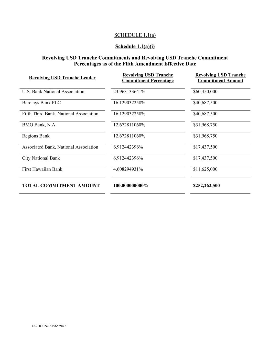 US-DOCS\161565394.6 SCHEDULE 1.1(a) Schedule 1.1(a)(i) Revolving USD Tranche Commitments and Revolving USD Tranche Commitment Percentages as of the Fifth Amendment Effective Date Revolving USD Tranche Lender Revolving USD Tranche Commitment Percentage Revolving USD Tranche Commitment Amount U.S. Bank National Association 23.963133641% $60,450,000 Barclays Bank PLC 16.129032258% $40,687,500 Fifth Third Bank, National Association 16.129032258% $40,687,500 BMO Bank, N.A. 12.672811060% $31,968,750 Regions Bank 12.672811060% $31,968,750 Associated Bank, National Association 6.912442396% $17,437,500 City National Bank 6.912442396% $17,437,500 First Hawaiian Bank 4.608294931% $11,625,000 TOTAL COMMITMENT AMOUNT 100.000000000% $252,262,500