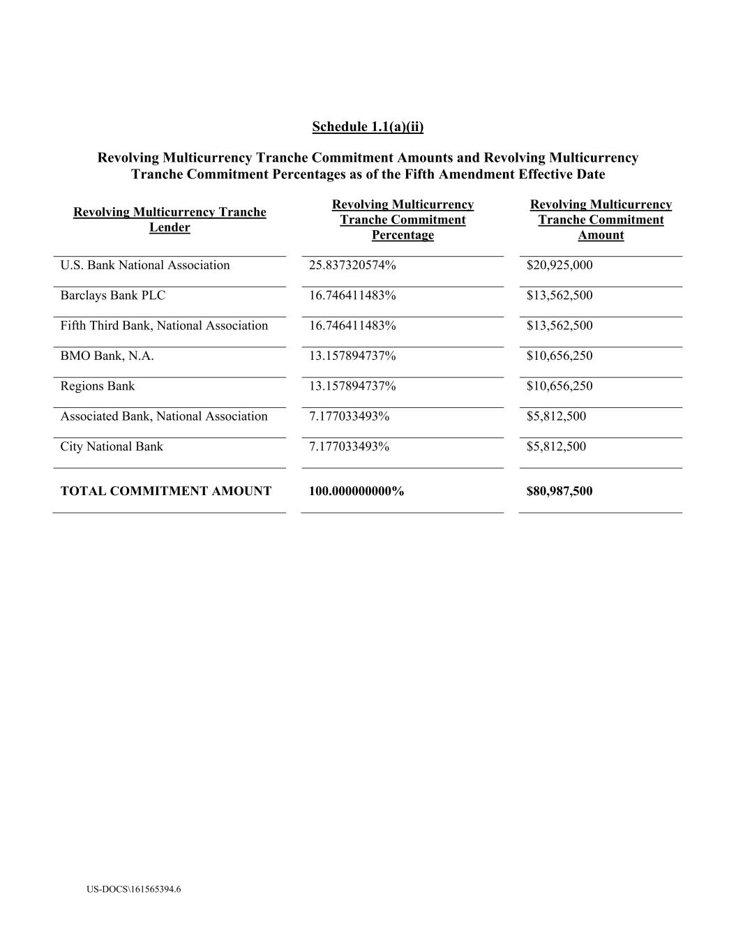 US-DOCS\161565394.6 Schedule 1.1(a)(ii) Revolving Multicurrency Tranche Commitment Amounts and Revolving Multicurrency Tranche Commitment Percentages as of the Fifth Amendment Effective Date Revolving Multicurrency Tranche Lender Revolving Multicurrency Tranche Commitment Percentage Revolving Multicurrency Tranche Commitment Amount U.S. Bank National Association 25.837320574% $20,925,000 Barclays Bank PLC 16.746411483% $13,562,500 Fifth Third Bank, National Association 16.746411483% $13,562,500 BMO Bank, N.A. 13.157894737% $10,656,250 Regions Bank 13.157894737% $10,656,250 Associated Bank, National Association 7.177033493% $5,812,500 City National Bank 7.177033493% $5,812,500 TOTAL COMMITMENT AMOUNT 100.000000000% $80,987,500
