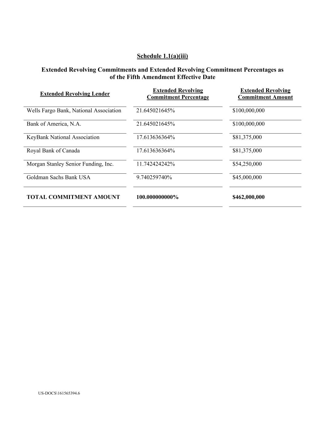 US-DOCS\161565394.6 Schedule 1.1(a)(iii) Extended Revolving Commitments and Extended Revolving Commitment Percentages as of the Fifth Amendment Effective Date Extended Revolving Lender Extended Revolving Commitment Percentage Extended Revolving Commitment Amount Wells Fargo Bank, National Association 21.645021645% $100,000,000 Bank of America, N.A. 21.645021645% $100,000,000 KeyBank National Association 17.613636364% $81,375,000 Royal Bank of Canada 17.613636364% $81,375,000 Morgan Stanley Senior Funding, Inc. 11.742424242% $54,250,000 Goldman Sachs Bank USA 9.740259740% $45,000,000 TOTAL COMMITMENT AMOUNT 100.000000000% $462,000,000