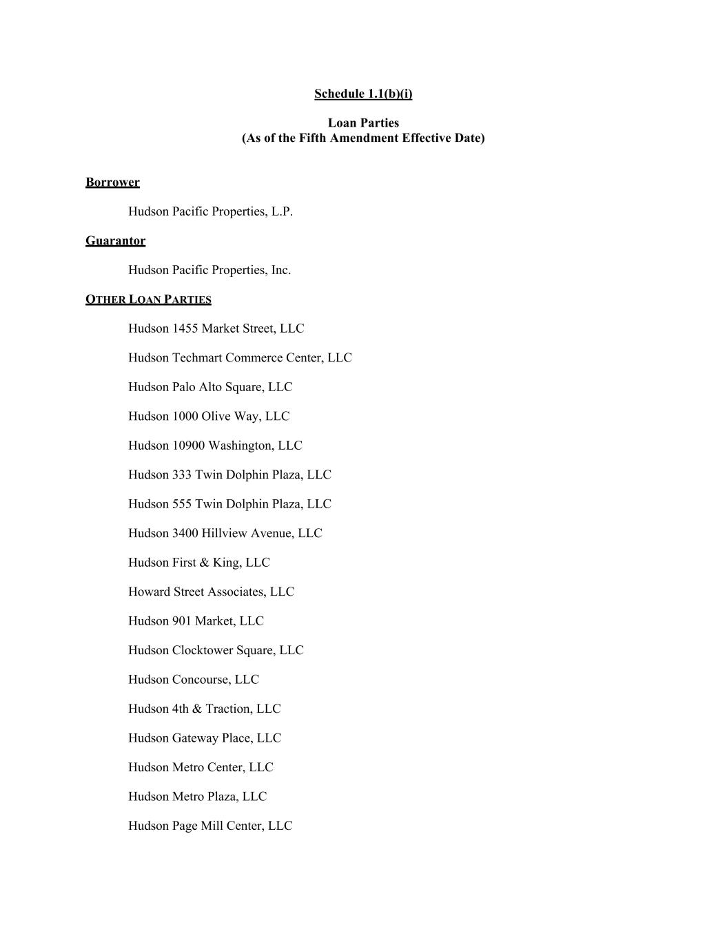Schedule 1.1(b)(i) Loan Parties (As of the Fifth Amendment Effective Date) Borrower Hudson Pacific Properties, L.P. Guarantor Hudson Pacific Properties, Inc. OTHER LOAN PARTIES Hudson 1455 Market Street, LLC Hudson Techmart Commerce Center, LLC Hudson Palo Alto Square, LLC Hudson 1000 Olive Way, LLC Hudson 10900 Washington, LLC Hudson 333 Twin Dolphin Plaza, LLC Hudson 555 Twin Dolphin Plaza, LLC Hudson 3400 Hillview Avenue, LLC Hudson First & King, LLC Howard Street Associates, LLC Hudson 901 Market, LLC Hudson Clocktower Square, LLC Hudson Concourse, LLC Hudson 4th & Traction, LLC Hudson Gateway Place, LLC Hudson Metro Center, LLC Hudson Metro Plaza, LLC Hudson Page Mill Center, LLC