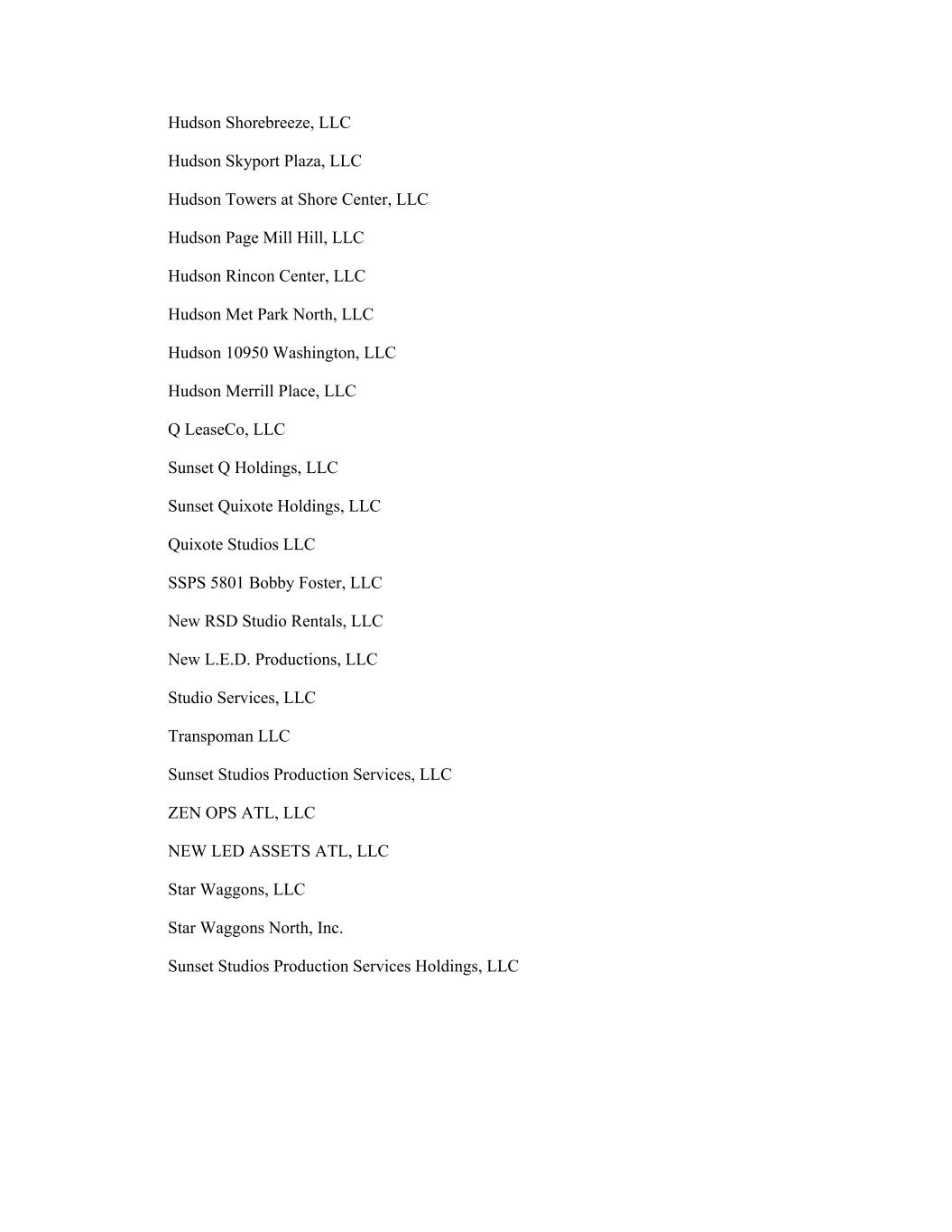 Hudson Shorebreeze, LLC Hudson Skyport Plaza, LLC Hudson Towers at Shore Center, LLC Hudson Page Mill Hill, LLC Hudson Rincon Center, LLC Hudson Met Park North, LLC Hudson 10950 Washington, LLC Hudson Merrill Place, LLC Q LeaseCo, LLC Sunset Q Holdings, LLC Sunset Quixote Holdings, LLC Quixote Studios LLC SSPS 5801 Bobby Foster, LLC New RSD Studio Rentals, LLC New L.E.D. Productions, LLC Studio Services, LLC Transpoman LLC Sunset Studios Production Services, LLC ZEN OPS ATL, LLC NEW LED ASSETS ATL, LLC Star Waggons, LLC Star Waggons North, Inc. Sunset Studios Production Services Holdings, LLC