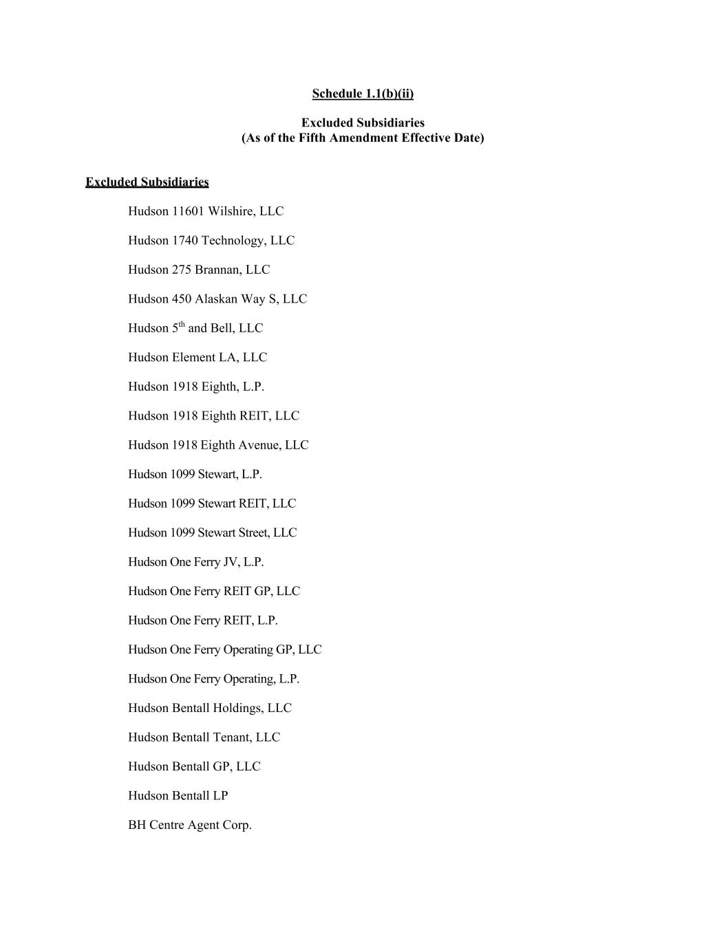 Schedule 1.1(b)(ii) Excluded Subsidiaries (As of the Fifth Amendment Effective Date) Excluded Subsidiaries Hudson 11601 Wilshire, LLC Hudson 1740 Technology, LLC Hudson 275 Brannan, LLC Hudson 450 Alaskan Way S, LLC Hudson 5th and Bell, LLC Hudson Element LA, LLC Hudson 1918 Eighth, L.P. Hudson 1918 Eighth REIT, LLC Hudson 1918 Eighth Avenue, LLC Hudson 1099 Stewart, L.P. Hudson 1099 Stewart REIT, LLC Hudson 1099 Stewart Street, LLC Hudson One Ferry JV, L.P. Hudson One Ferry REIT GP, LLC Hudson One Ferry REIT, L.P. Hudson One Ferry Operating GP, LLC Hudson One Ferry Operating, L.P. Hudson Bentall Holdings, LLC Hudson Bentall Tenant, LLC Hudson Bentall GP, LLC Hudson Bentall LP BH Centre Agent Corp.