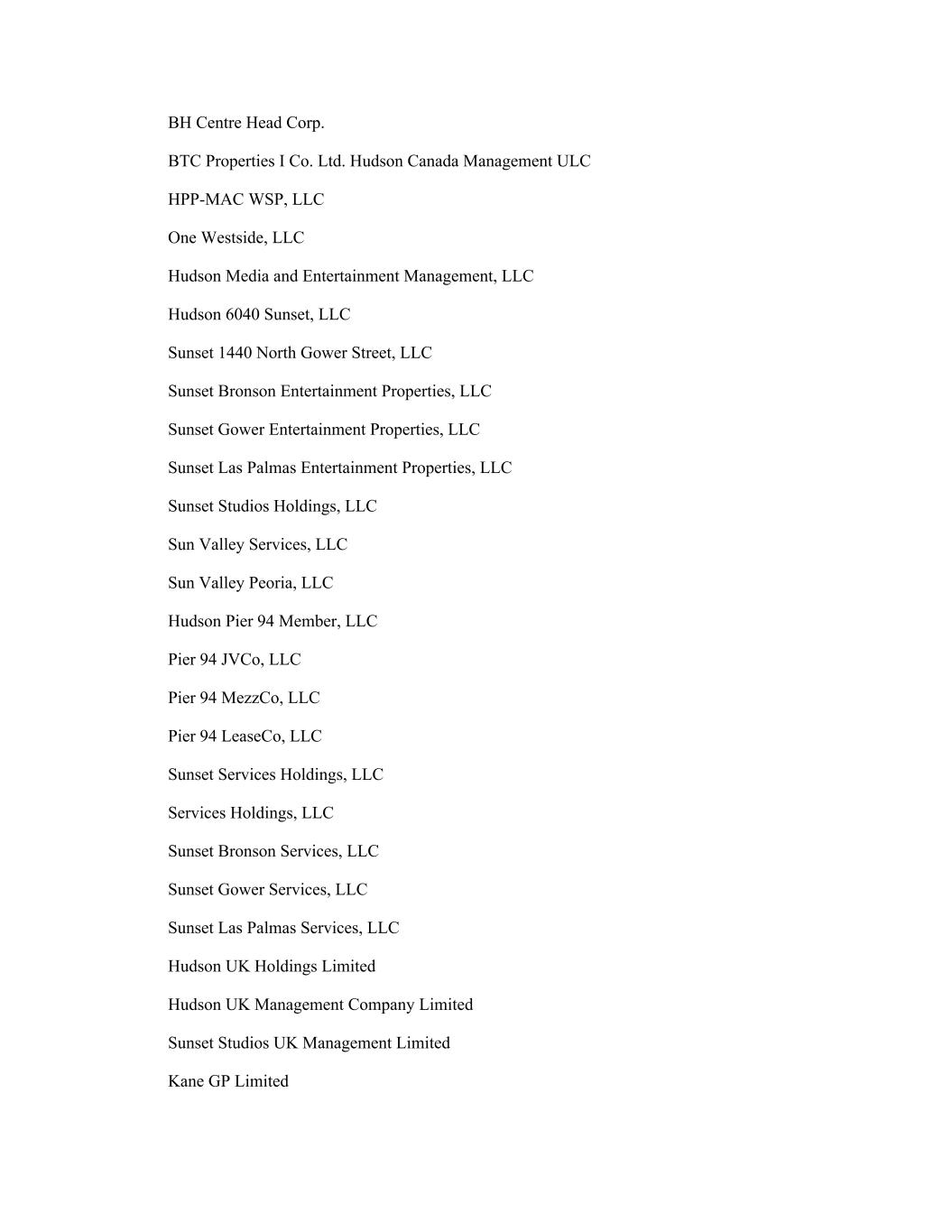 BH Centre Head Corp. BTC Properties I Co. Ltd. Hudson Canada Management ULC HPP-MAC WSP, LLC One Westside, LLC Hudson Media and Entertainment Management, LLC Hudson 6040 Sunset, LLC Sunset 1440 North Gower Street, LLC Sunset Bronson Entertainment Properties, LLC Sunset Gower Entertainment Properties, LLC Sunset Las Palmas Entertainment Properties, LLC Sunset Studios Holdings, LLC Sun Valley Services, LLC Sun Valley Peoria, LLC Hudson Pier 94 Member, LLC Pier 94 JVCo, LLC Pier 94 MezzCo, LLC Pier 94 LeaseCo, LLC Sunset Services Holdings, LLC Services Holdings, LLC Sunset Bronson Services, LLC Sunset Gower Services, LLC Sunset Las Palmas Services, LLC Hudson UK Holdings Limited Hudson UK Management Company Limited Sunset Studios UK Management Limited Kane GP Limited