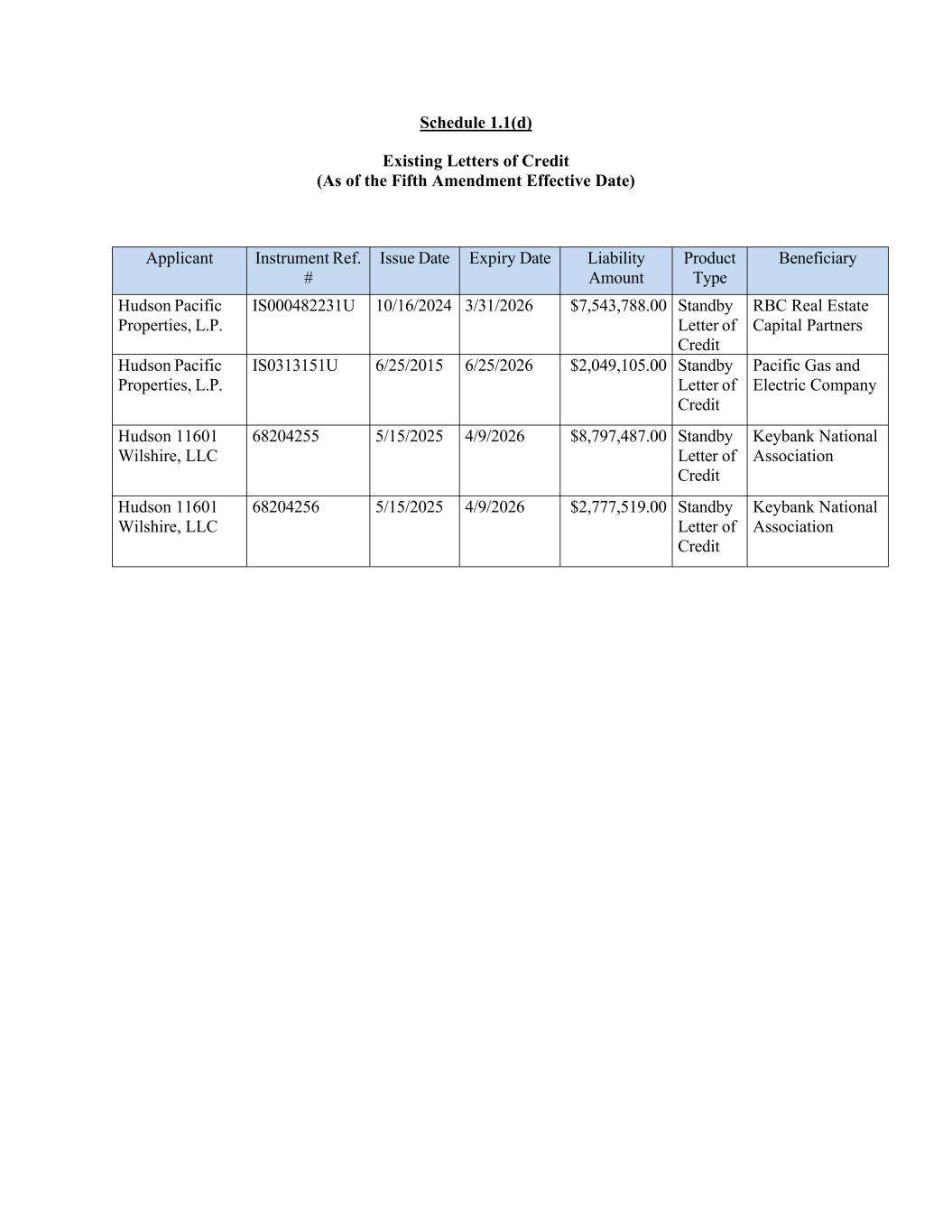 Schedule 1.1(d) Existing Letters of Credit (As of the Fifth Amendment Effective Date) Applicant Instrument Ref. # Issue Date Expiry Date Liability Amount Product Type Beneficiary Hudson Pacific Properties, L.P. IS000482231U 10/16/2024 3/31/2026 $7,543,788.00 Standby Letter of Credit RBC Real Estate Capital Partners Hudson Pacific Properties, L.P. IS0313151U 6/25/2015 6/25/2026 $2,049,105.00 Standby Letter of Credit Pacific Gas and Electric Company Hudson 11601 Wilshire, LLC 68204255 5/15/2025 4/9/2026 $8,797,487.00 Standby Letter of Credit Keybank National Association Hudson 11601 Wilshire, LLC 68204256 5/15/2025 4/9/2026 $2,777,519.00 Standby Letter of Credit Keybank National Association