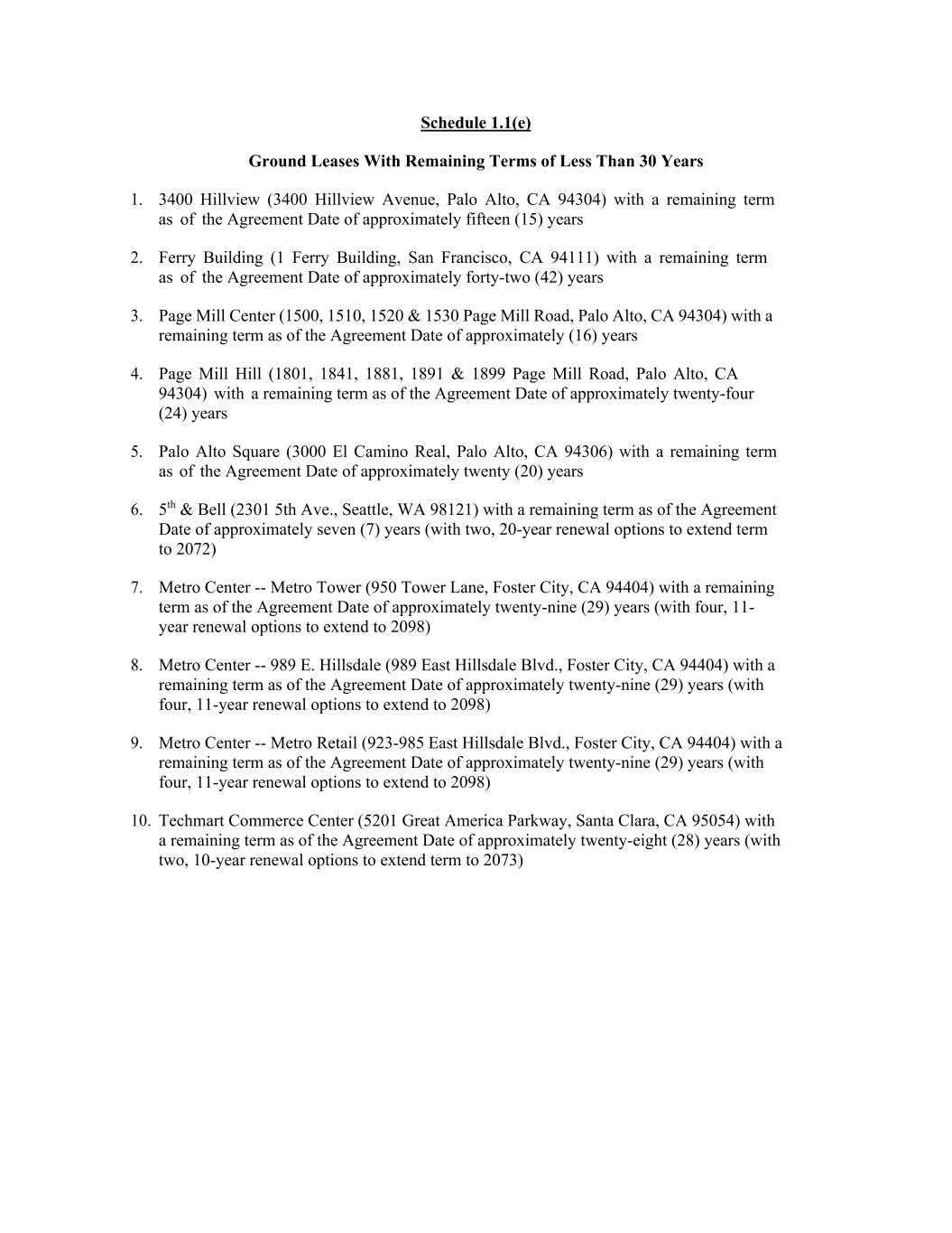 Schedule 1.1(e) Ground Leases With Remaining Terms of Less Than 30 Years 1. 3400 Hillview (3400 Hillview Avenue, Palo Alto, CA 94304) with a remaining term as of the Agreement Date of approximately fifteen (15) years 2. Ferry Building (1 Ferry Building, San Francisco, CA 94111) with a remaining term as of the Agreement Date of approximately forty-two (42) years 3. Page Mill Center (1500, 1510, 1520 & 1530 Page Mill Road, Palo Alto, CA 94304) with a remaining term as of the Agreement Date of approximately (16) years 4. Page Mill Hill (1801, 1841, 1881, 1891 & 1899 Page Mill Road, Palo Alto, CA 94304) with a remaining term as of the Agreement Date of approximately twenty-four (24) years 5. Palo Alto Square (3000 El Camino Real, Palo Alto, CA 94306) with a remaining term as of the Agreement Date of approximately twenty (20) years 6. 5th & Bell (2301 5th Ave., Seattle, WA 98121) with a remaining term as of the Agreement Date of approximately seven (7) years (with two, 20-year renewal options to extend term to 2072) 7. Metro Center -- Metro Tower (950 Tower Lane, Foster City, CA 94404) with a remaining term as of the Agreement Date of approximately twenty-nine (29) years (with four, 11- year renewal options to extend to 2098) 8. Metro Center -- 989 E. Hillsdale (989 East Hillsdale Blvd., Foster City, CA 94404) with a remaining term as of the Agreement Date of approximately twenty-nine (29) years (with four, 11-year renewal options to extend to 2098) 9. Metro Center -- Metro Retail (923-985 East Hillsdale Blvd., Foster City, CA 94404) with a remaining term as of the Agreement Date of approximately twenty-nine (29) years (with four, 11-year renewal options to extend to 2098) 10. Techmart Commerce Center (5201 Great America Parkway, Santa Clara, CA 95054) with a remaining term as of the Agreement Date of approximately twenty-eight (28) years (with two, 10-year renewal options to extend term to 2073)