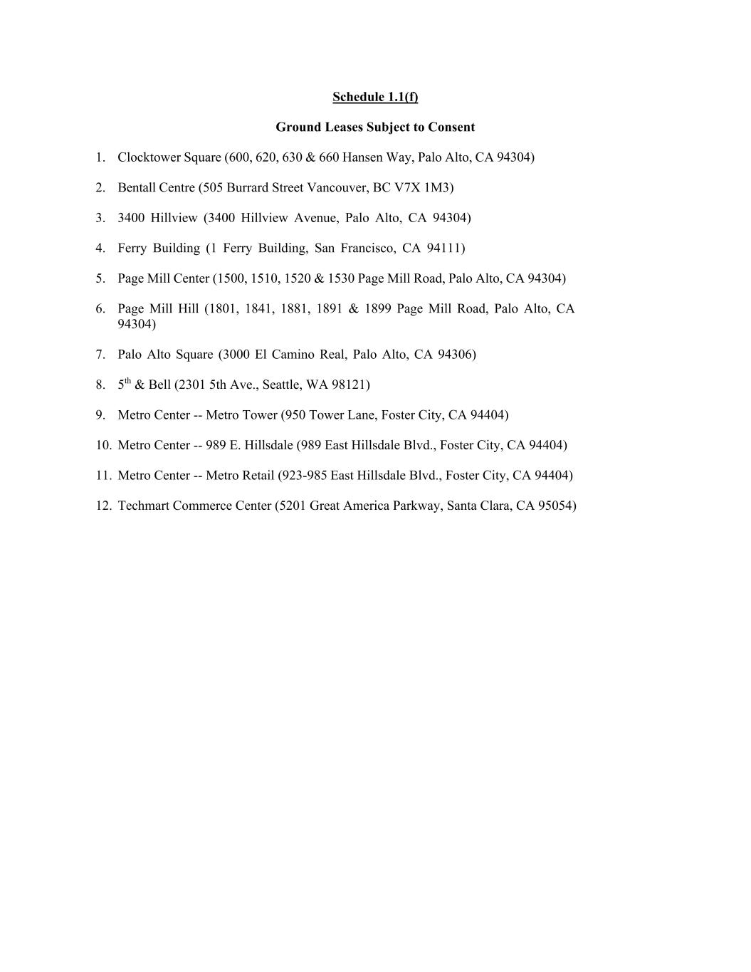 Schedule 1.1(f) Ground Leases Subject to Consent 1. Clocktower Square (600, 620, 630 & 660 Hansen Way, Palo Alto, CA 94304) 2. Bentall Centre (505 Burrard Street Vancouver, BC V7X 1M3) 3. 3400 Hillview (3400 Hillview Avenue, Palo Alto, CA 94304) 4. Ferry Building (1 Ferry Building, San Francisco, CA 94111) 5. Page Mill Center (1500, 1510, 1520 & 1530 Page Mill Road, Palo Alto, CA 94304) 6. Page Mill Hill (1801, 1841, 1881, 1891 & 1899 Page Mill Road, Palo Alto, CA 94304) 7. Palo Alto Square (3000 El Camino Real, Palo Alto, CA 94306) 8. 5th & Bell (2301 5th Ave., Seattle, WA 98121) 9. Metro Center -- Metro Tower (950 Tower Lane, Foster City, CA 94404) 10. Metro Center -- 989 E. Hillsdale (989 East Hillsdale Blvd., Foster City, CA 94404) 11. Metro Center -- Metro Retail (923-985 East Hillsdale Blvd., Foster City, CA 94404) 12. Techmart Commerce Center (5201 Great America Parkway, Santa Clara, CA 95054)