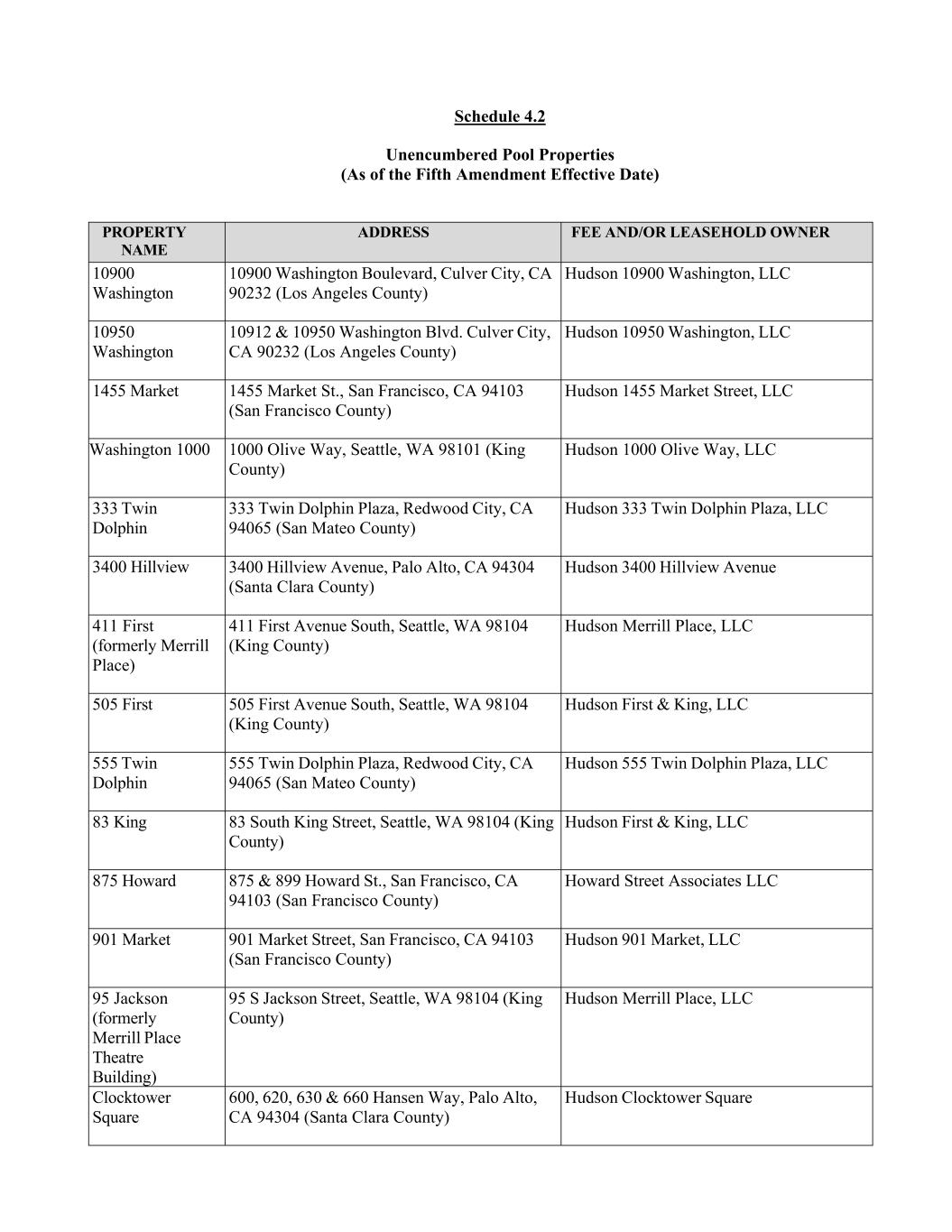 Schedule 4.2 Unencumbered Pool Properties (As of the Fifth Amendment Effective Date) PROPERTY NAME ADDRESS FEE AND/OR LEASEHOLD OWNER 10900 Washington 10900 Washington Boulevard, Culver City, CA 90232 (Los Angeles County) Hudson 10900 Washington, LLC 10950 Washington 10912 & 10950 Washington Blvd. Culver City, CA 90232 (Los Angeles County) Hudson 10950 Washington, LLC 1455 Market 1455 Market St., San Francisco, CA 94103 (San Francisco County) Hudson 1455 Market Street, LLC Washington 1000 1000 Olive Way, Seattle, WA 98101 (King County) Hudson 1000 Olive Way, LLC 333 Twin Dolphin 333 Twin Dolphin Plaza, Redwood City, CA 94065 (San Mateo County) Hudson 333 Twin Dolphin Plaza, LLC 3400 Hillview 3400 Hillview Avenue, Palo Alto, CA 94304 (Santa Clara County) Hudson 3400 Hillview Avenue 411 First (formerly Merrill Place) 411 First Avenue South, Seattle, WA 98104 (King County) Hudson Merrill Place, LLC 505 First 505 First Avenue South, Seattle, WA 98104 (King County) Hudson First & King, LLC 555 Twin Dolphin 555 Twin Dolphin Plaza, Redwood City, CA 94065 (San Mateo County) Hudson 555 Twin Dolphin Plaza, LLC 83 King 83 South King Street, Seattle, WA 98104 (King County) Hudson First & King, LLC 875 Howard 875 & 899 Howard St., San Francisco, CA 94103 (San Francisco County) Howard Street Associates LLC 901 Market 901 Market Street, San Francisco, CA 94103 (San Francisco County) Hudson 901 Market, LLC 95 Jackson (formerly Merrill Place Theatre Building) 95 S Jackson Street, Seattle, WA 98104 (King County) Hudson Merrill Place, LLC Clocktower Square 600, 620, 630 & 660 Hansen Way, Palo Alto, CA 94304 (Santa Clara County) Hudson Clocktower Square