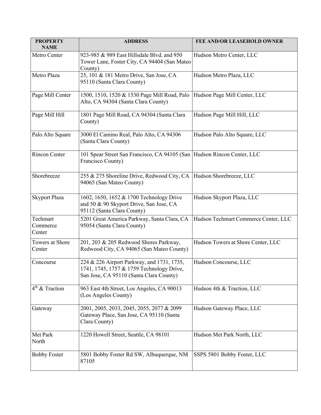 PROPERTY NAME ADDRESS FEE AND/OR LEASEHOLD OWNER Metro Center 923-985 & 989 East Hillsdale Blvd. and 950 Tower Lane, Foster City, CA 94404 (San Mateo County) Hudson Metro Center, LLC Metro Plaza 25, 101 & 181 Metro Drive, San Jose, CA 95110 (Santa Clara County) Hudson Metro Plaza, LLC Page Mill Center 1500, 1510, 1520 & 1530 Page Mill Road, Palo Alto, CA 94304 (Santa Clara County) Hudson Page Mill Center, LLC Page Mill Hill 1801 Page Mill Road, CA 94304 (Santa Clara County) Hudson Page Mill Hill, LLC Palo Alto Square 3000 El Camino Real, Palo Alto, CA 94306 (Santa Clara County) Hudson Palo Alto Square, LLC Rincon Center 101 Spear Street San Francisco, CA 94105 (San Francisco County) Hudson Rincon Center, LLC Shorebreeze 255 & 275 Shoreline Drive, Redwood City, CA 94065 (San Mateo County) Hudson Shorebreeze, LLC Skyport Plaza 1602, 1650, 1652 & 1700 Technology Drive and 50 & 90 Skyport Drive, San Jose, CA 95112 (Santa Clara County) Hudson Skyport Plaza, LLC Techmart Commerce Center 5201 Great America Parkway, Santa Clara, CA 95054 (Santa Clara County) Hudson Techmart Commerce Center, LLC Towers at Shore Center 201, 203 & 205 Redwood Shores Parkway, Redwood City, CA 94065 (San Mateo County) Hudson Towers at Shore Center, LLC Concourse 224 & 226 Airport Parkway, and 1731, 1735, 1741, 1745, 1757 & 1759 Technology Drive, San Jose, CA 95110 (Santa Clara County) Hudson Concourse, LLC 4th & Traction 963 East 4th Street, Los Angeles, CA 90013 (Los Angeles County) Hudson 4th & Traction, LLC Gateway 2001, 2005, 2033, 2045, 2055, 2077 & 2099 Gateway Place, San Jose, CA 95110 (Santa Clara County) Hudson Gateway Place, LLC Met Park North 1220 Howell Street, Seattle, CA 98101 Hudson Met Park North, LLC Bobby Foster 5801 Bobby Foster Rd SW, Albuquerque, NM 87105 SSPS 5801 Bobby Foster, LLC