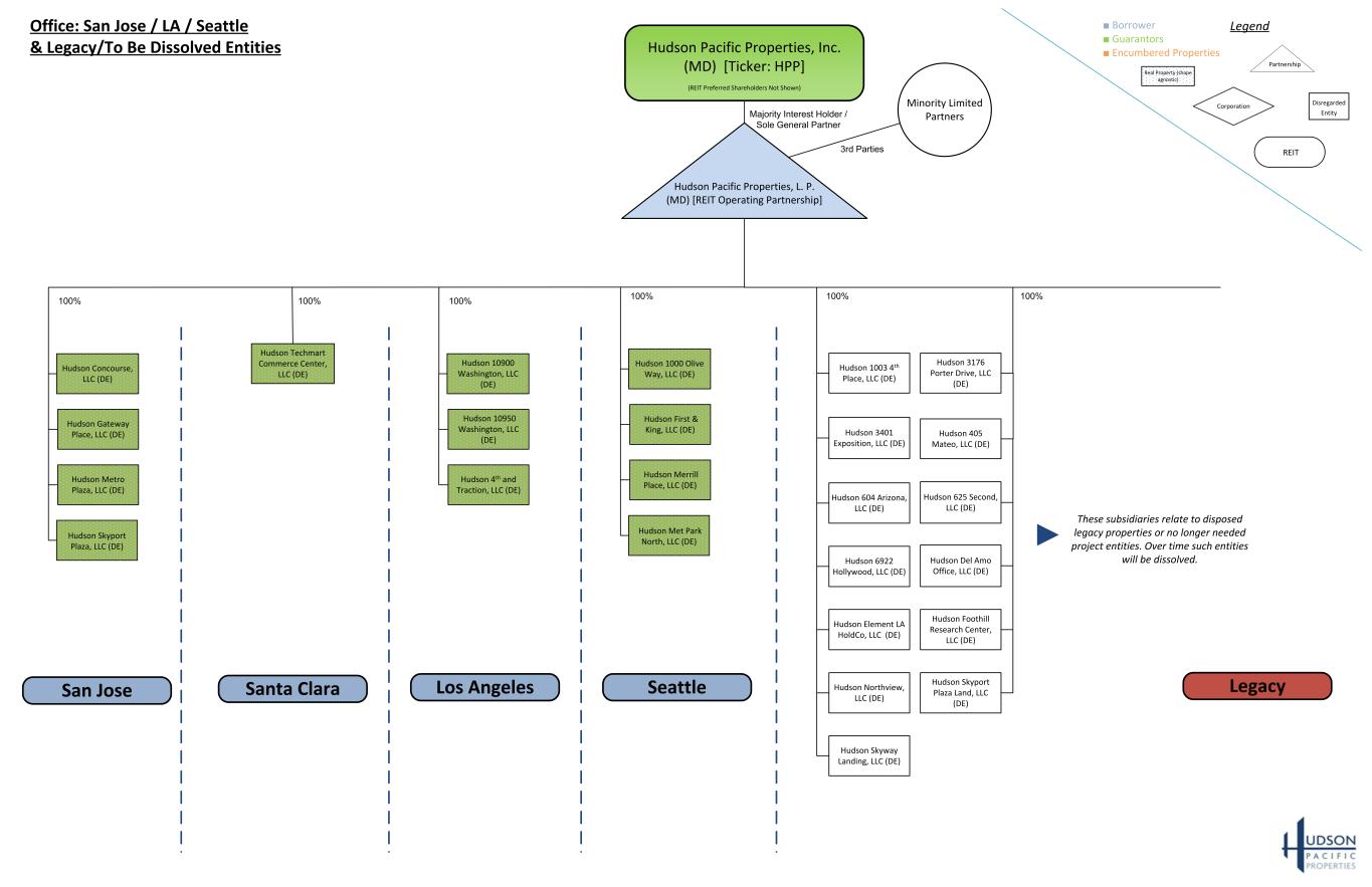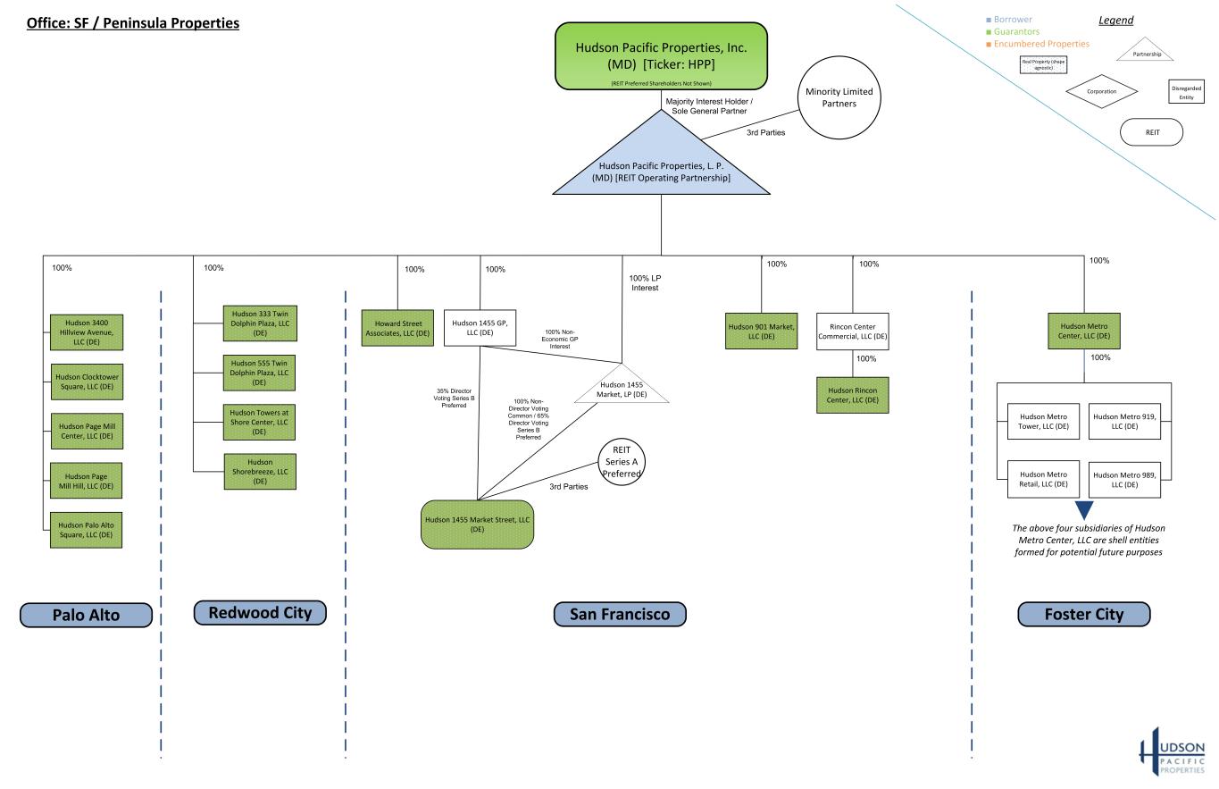 Minority Limited Partners Hudson Pacific Properties, Inc. (MD) [Ticker: HPP] (REIT Preferred Shareholders Not Shown) Hudson 555 Twin Dolphin Plaza, LLC (DE) Hudson 333 Twin Dolphin Plaza, LLC (DE) Hudson Palo Alto Square, LLC (DE) Hudson 3400 Hillview Avenue, LLC (DE) Hudson Page Mill Center, LLC (DE) Hudson Towers at Shore Center, LLC (DE) Hudson Shorebreeze, LLC (DE)Hudson Page Mill Hill, LLC (DE) Hudson Pacific Properties, L. P. (MD) [REIT Operating Partnership] Hudson Clocktower Square, LLC (DE) Office: SF / Peninsula Properties Hudson Metro Tower, LLC (DE) Hudson Metro Retail, LLC (DE) Hudson Metro 989, LLC (DE) Hudson Metro 919, LLC (DE) Hudson Metro Center, LLC (DE) Hudson 901 Market, LLC (DE) Rincon Center Commercial, LLC (DE) Howard Street Associates, LLC (DE) Hudson 1455 Market, LP (DE) Hudson 1455 Market Street, LLC (DE) Hudson 1455 GP, LLC (DE) Hudson Rincon Center, LLC (DE) 35% Director Voting Series B Preferred 100% Non- Director Voting Common / 65% Director Voting Series B Preferred 100% Non- Economic GP Interest 100% LP Interest 100% 100% 100% 100% San FranciscoRedwood City 100% 100% Palo Alto Foster City 100% 3rd Parties 100% 100% The above four subsidiaries of Hudson Metro Center, LLC are shell entities formed for potential future purposes 3rd Parties Majority Interest Holder / Sole General Partner REIT Series A Preferred ■ Borrower ■ Guarantors ■ Encumbered Properties Legend REIT Partnership Disregarded Entity Corporation Real Property (shape agnostic)