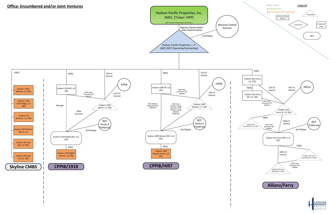 Minority Limited Partners Hudson Pacific Properties, Inc. (MD) [Ticker: HPP] (REIT Preferred Shareholders Not Shown) Hudson 5th and Bell, LLC (DE) Hudson 11601 Wilshire, LLC (DE) Hudson 275 Brannan, LLC (DE) Hudson 450 Alaskan Way S, LLC Hudson Pacific Properties, L. P. (MD) [REIT Operating Partnership] Hudson 1740 Technology, LLC (DE) Office: Encumbered and/or Joint Ventures Hudson 1918 Eighth, L.P. (DE) Hudson 1918 Eighth REIT, LLC (DE) Hudson 1918 GP, LLC (DE) Manager 100% Common CPPIB 100% Non- Economic GP Interest 100% CPPIB/1918 100% Skyline CMBS 45% LP Interest 3rd Parties Majority Interest Holder / Sole General Partner Hudson Element LA, LLC (DE) 55% LP Interest REIT Series A Preferred 3rd Parties Hudson 1918 Eighth Avenue, LLC (DE) 100% Hudson 1099 Stewart, L.P. (DE) Hudson 1099 Stewart REIT, LLC (DE) Hudson 1099 GP, LLC (DE) CPPIB 100% Non- Economic GP Interest 100% CPPIB/Hill7 45% LP Interest 55% LP Interest REIT Series A Preferred 3rd Parties Hudson 1099 Stewart Street, LLC (DE) 100% 35% Director Voting Series B Preferred 100% Non- Director Voting Common / 65% Director Voting Series B Preferred Hudson One Ferry JV, L.P. (DE) Hudson One Ferry REIT, L.P. (DE) Hudson One Ferry, LLC (DE) Allianz 100% Non- Economic GP Interest 45% LP Interest 55% LP Interest REIT Preferred 3rd Parties Allianz/Ferry Hudson One Ferry GP, LLC (DE) 100% 100% Hudson One Ferry Operating, L.P. (DE) Hudson One Ferry REIT GP, LLC (DE) 100% 100% Non- Economic GP Interest 100% LP Interest Hudson One Ferry Operating GP, LLC (DE) 100% LP Interest 100% 100% Non- Economic GP Interest ■ Borrower ■ Guarantors ■ Encumbered Properties Legend REIT Partnership Disregarded Entity Corporation Real Property (shape agnostic)