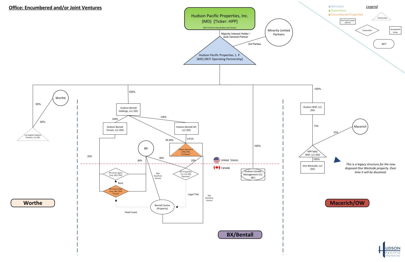 Minority Limited Partners Hudson Pacific Properties, Inc. (MD) [Ticker: HPP] (REIT Preferred Shareholders Not Shown) Hudson Pacific Properties, L. P. (MD) [REIT Operating Partnership] Office: Encumbered and/or Joint Ventures Worthe 100% This is a legacy structure for the now disposed One Westside property. Over time it will be dissolved. 3rd Parties Majority Interest Holder / Sole General Partner Hudson Bentall LP (ON) [TRS] “Co-Owner” Hudson Bentall Holdings, LLC (DE) BX 100% BX/Bentall 100% 75% Hudson WSP, LLC (DE) One Westside, LLC (DE) HPP-MAC WSP, LLC (DE) Macerich 25% 100% Macerich/OW Los Angeles Stadium Partners, LLC (DE) Worthe 50% 50% Hudson Bentall GP, LLC (DE) Hudson Bentall Tenant, LLC (DE) BH Centre Head Corp. (BC) [TRS] “Tenant” BH Centre Agent Corp. (BC) [TRS] 100% 100% 99.99% 0.01% BTC Properties I Co. Ltd. (BC) “Nominee” 20% 80% 80% 20% Hudson Canada Management ULC (BC) Head Lease Bentall Centre (Property) Legal Title Rent 20% Beneficial Interest 80% Beneficial Interest ■ Borrower ■ Guarantors ■ Encumbered Properties Legend REIT Partnership Disregarded Entity Corporation Real Property (shape agnostic)