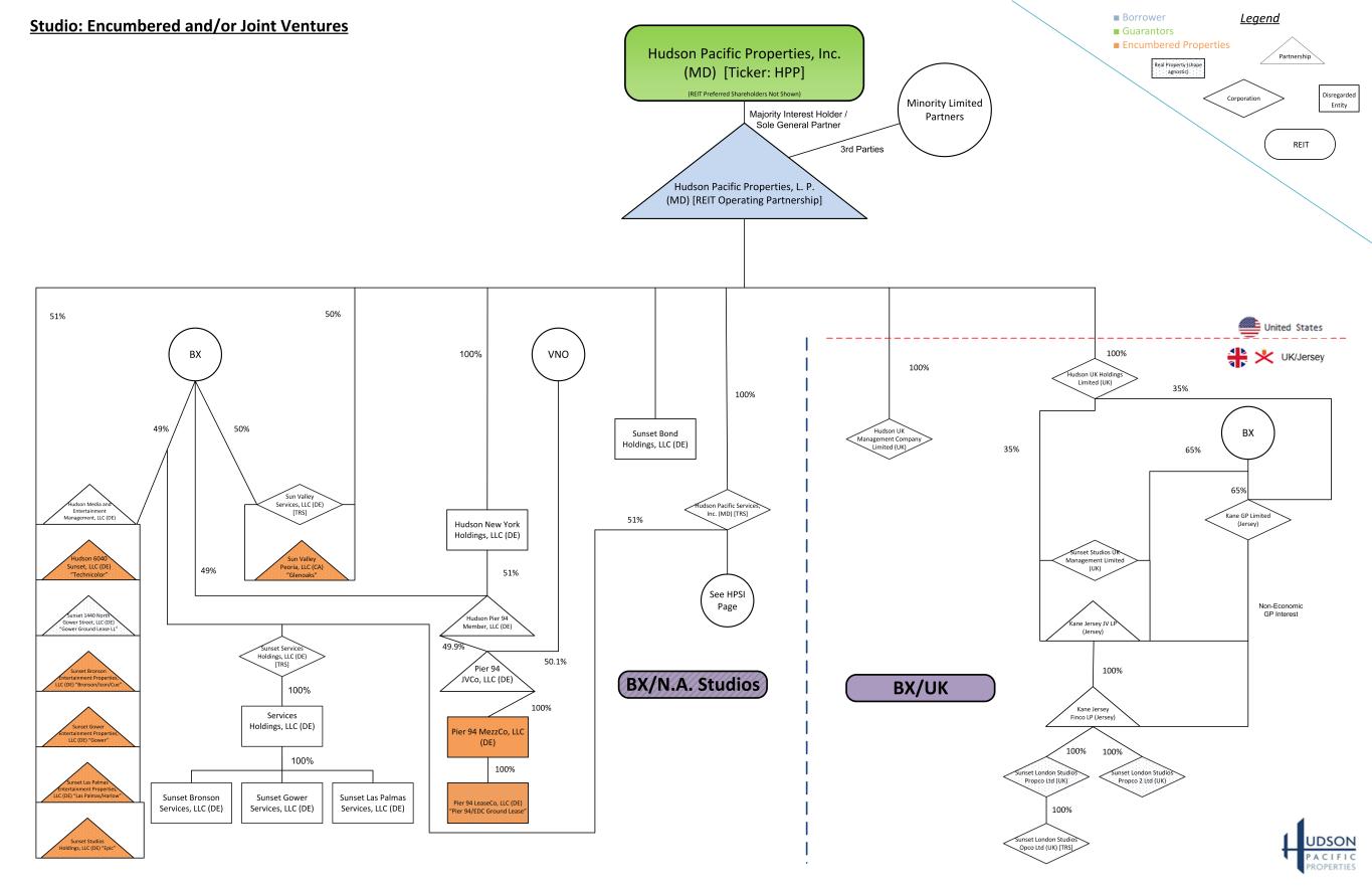 Minority Limited Partners Hudson Pacific Properties, Inc. (MD) [Ticker: HPP] (REIT Preferred Shareholders Not Shown) Hudson Pacific Properties, L. P. (MD) [REIT Operating Partnership] Studio: Encumbered and/or Joint Ventures 3rd Parties Majority Interest Holder / Sole General Partner BX/N.A. Studios 100% 51% Sunset Las Palmas Entertainment Properties, LLC (DE) “Las Palmas/Harlow” Sunset Bronson Entertainment Properties, LLC (DE) “Bronson/Icon/Cue” Sunset Gower Entertainment Properties, LLC (DE) “Gower” Sunset Studios Holdings, LLC (DE) “Epic” BX Hudson 6040 Sunset, LLC (DE) “Technicolor” Sunset 1440 North Gower Street, LLC (DE) “Gower Ground Lease LL” Hudson Media and Entertainment Management, LLC (DE) Sun Valley Peoria, LLC (CA) “Glenoaks” Sun Valley Services, LLC (DE) [TRS] Hudson Pacific Services, Inc. (MD) [TRS] Sunset Gower Services, LLC (DE) Services Holdings, LLC (DE) Sunset Las Palmas Services, LLC (DE) Sunset Bronson Services, LLC (DE) 49% 50% 50% Pier 94 JVCo, LLC (DE) Pier 94 LeaseCo, LLC (DE) “Pier 94/EDC Ground Lease” Pier 94 MezzCo, LLC (DE) Hudson Pier 94 Member, LLC (DE) 49% Hudson New York Holdings, LLC (DE) VNO 49.9% 50.1% 51% 100% 100% 100% Sunset Services Holdings, LLC (DE) [TRS] 51% 100% 100% See HPSI Page Sunset Bond Holdings, LLC (DE) BX/UK Kane Jersey JV LP (Jersey) Hudson UK Management Company Limited (UK) Hudson UK Holdings Limited (UK) BX Sunset Studios UK Management Limited (UK) Kane GP Limited (Jersey) 35% 35% 65% 65% Kane Jersey Finco LP (Jersey) Non-Economic GP Interest 100% 100% 100% Sunset London Studios Propco Ltd (UK) Sunset London Studios Propco 2 Ltd (UK) Sunset London Studios Opco Ltd (UK) [TRS] 100% 100% 100% ■ Borrower ■ Guarantors ■ Encumbered Properties Legend REIT Partnership Disregarded Entity Corporation Real Property (shape agnostic)