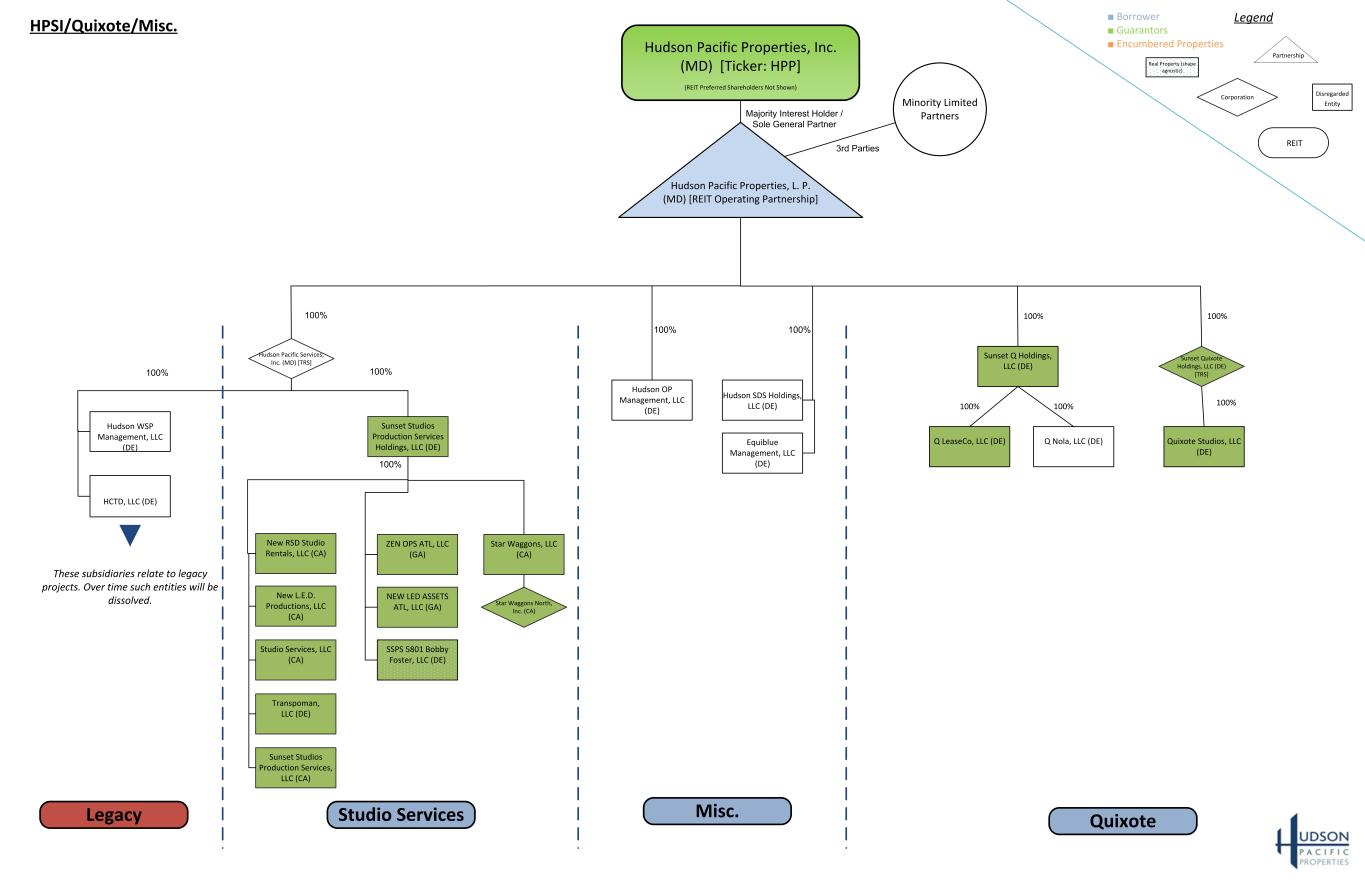 Minority Limited Partners Hudson Pacific Properties, Inc. (MD) [Ticker: HPP] (REIT Preferred Shareholders Not Shown) Hudson Pacific Properties, L. P. (MD) [REIT Operating Partnership] HPSI/Quixote/Misc. Hudson WSP Management, LLC (DE) HCTD, LLC (DE) Misc. 100% Legacy 3rd Parties Majority Interest Holder / Sole General Partner 100% Quixote 100% 100% Hudson Pacific Services, Inc. (MD) [TRS] These subsidiaries relate to legacy projects. Over time such entities will be dissolved. New RSD Studio Rentals, LLC (CA) Studio Services, LLC (CA) Sunset Studios Production Services Holdings, LLC (DE) New L.E.D. Productions, LLC (CA) Transpoman, LLC (DE) Sunset Studios Production Services, LLC (CA) ZEN OPS ATL, LLC (GA) NEW LED ASSETS ATL, LLC (GA) Star Waggons, LLC (CA) 100% SSPS 5801 Bobby Foster, LLC (DE) Star Waggons North, Inc. (CA) 100% Studio Services Hudson OP Management, LLC (DE) Hudson SDS Holdings, LLC (DE) Equiblue Management, LLC (DE) Sunset Quixote Holdings, LLC (DE) [TRS] 100% 100% Quixote Studios, LLC (DE) Q Nola, LLC (DE) Sunset Q Holdings, LLC (DE) Q LeaseCo, LLC (DE) 100%100%100% ■ Borrower ■ Guarantors ■ Encumbered Properties Legend REIT Partnership Disregarded Entity Corporation Real Property (shape agnostic)