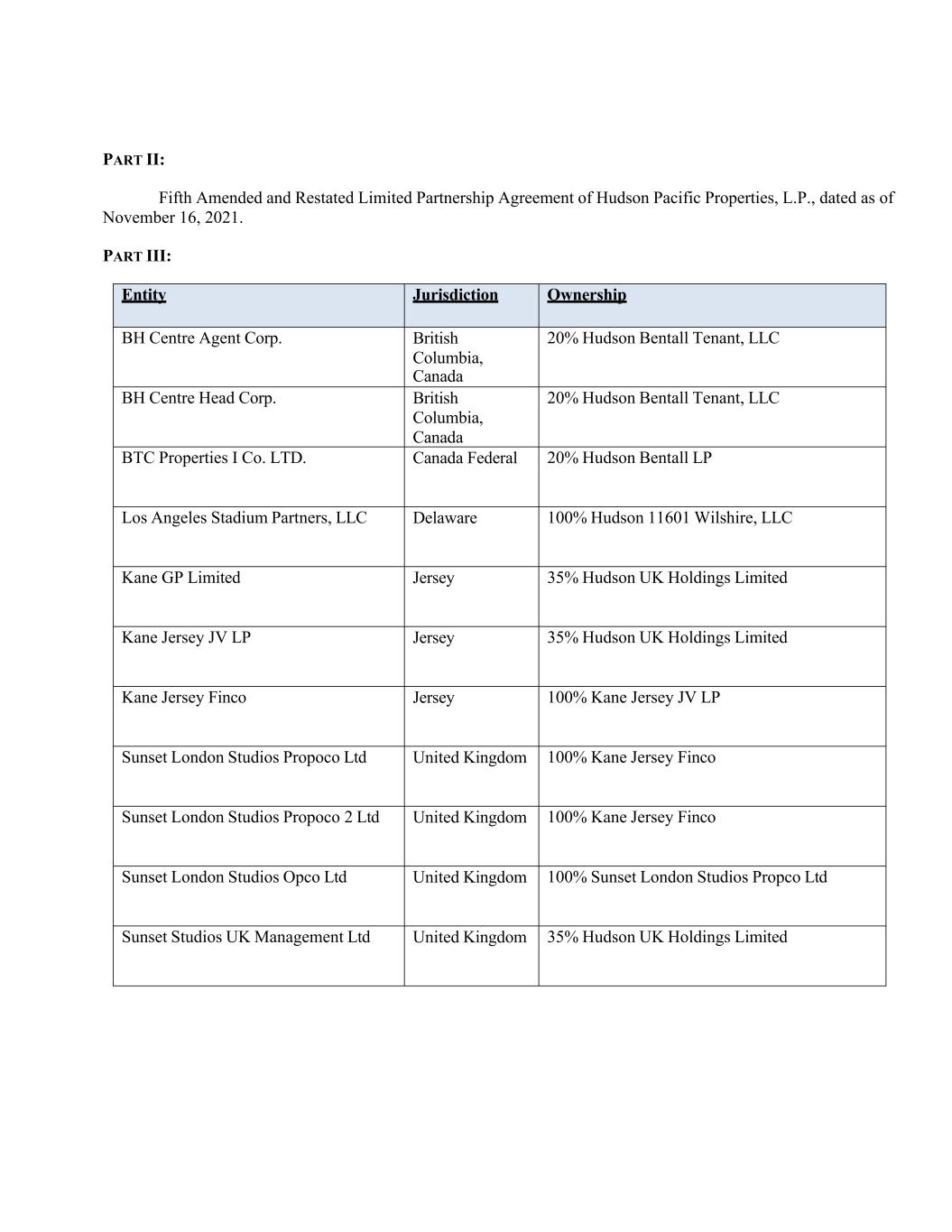 PART II: Fifth Amended and Restated Limited Partnership Agreement of Hudson Pacific Properties, L.P., dated as of November 16, 2021. PART III: Entity Jurisdiction Ownership BH Centre Agent Corp. British Columbia, Canada 20% Hudson Bentall Tenant, LLC BH Centre Head Corp. British Columbia, Canada 20% Hudson Bentall Tenant, LLC BTC Properties I Co. LTD. Canada Federal 20% Hudson Bentall LP Los Angeles Stadium Partners, LLC Delaware 100% Hudson 11601 Wilshire, LLC Kane GP Limited Jersey 35% Hudson UK Holdings Limited Kane Jersey JV LP Jersey 35% Hudson UK Holdings Limited Kane Jersey Finco Jersey 100% Kane Jersey JV LP Sunset London Studios Propoco Ltd United Kingdom 100% Kane Jersey Finco Sunset London Studios Propoco 2 Ltd United Kingdom 100% Kane Jersey Finco Sunset London Studios Opco Ltd United Kingdom 100% Sunset London Studios Propco Ltd Sunset Studios UK Management Ltd United Kingdom 35% Hudson UK Holdings Limited