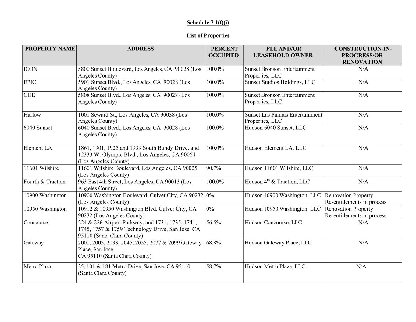 Schedule 7.1(f)(i) List of Properties PROPERTY NAME ADDRESS PERCENT OCCUPIED FEE AND/OR LEASEHOLD OWNER CONSTRUCTION-IN- PROGRESS/OR RENOVATION ICON 5800 Sunset Boulevard, Los Angeles, CA 90028 (Los Angeles County) 100.0% Sunset Bronson Entertainment Properties, LLC N/A EPIC 5901 Sunset Blvd., Los Angeles, CA 90028 (Los Angeles County) 100.0% Sunset Studios Holdings, LLC N/A CUE 5808 Sunset Blvd., Los Angeles, CA 90028 (Los Angeles County) 100.0% Sunset Bronson Entertainment Properties, LLC N/A Harlow 1001 Seward St., Los Angeles, CA 90038 (Los Angeles County) 100.0% Sunset Las Palmas Entertainment Properties, LLC N/A 6040 Sunset 6040 Sunset Blvd., Los Angeles, CA 90028 (Los Angeles County) 100.0% Hudson 6040 Sunset, LLC N/A Element LA 1861, 1901, 1925 and 1933 South Bundy Drive, and 12333 W. Olympic Blvd., Los Angeles, CA 90064 (Los Angeles County) 100.0% Hudson Element LA, LLC N/A 11601 Wilshire 11601 Wilshire Boulevard, Los Angeles, CA 90025 (Los Angeles County) 90.7% Hudson 11601 Wilshire, LLC N/A Fourth & Traction 963 East 4th Street, Los Angeles, CA 90013 (Los Angeles County) 100.0% Hudson 4th & Traction, LLC N/A 10900 Washington 10900 Washington Boulevard, Culver City, CA 90232 (Los Angeles County) 0% Hudson 10900 Washington, LLC Renovation Property Re-entitlements in process 10950 Washington 10912 & 10950 Washington Blvd. Culver City, CA 90232 (Los Angeles County) 0% Hudson 10950 Washington, LLC Renovation Property Re-entitlements in process Concourse 224 & 226 Airport Parkway, and 1731, 1735, 1741, 1745, 1757 & 1759 Technology Drive, San Jose, CA 95110 (Santa Clara County) 56.5% Hudson Concourse, LLC N/A Gateway 2001, 2005, 2033, 2045, 2055, 2077 & 2099 Gateway Place, San Jose, CA 95110 (Santa Clara County) 68.8% Hudson Gateway Place, LLC N/A Metro Plaza 25, 101 & 181 Metro Drive, San Jose, CA 95110 (Santa Clara County) 58.7% Hudson Metro Plaza, LLC N/A