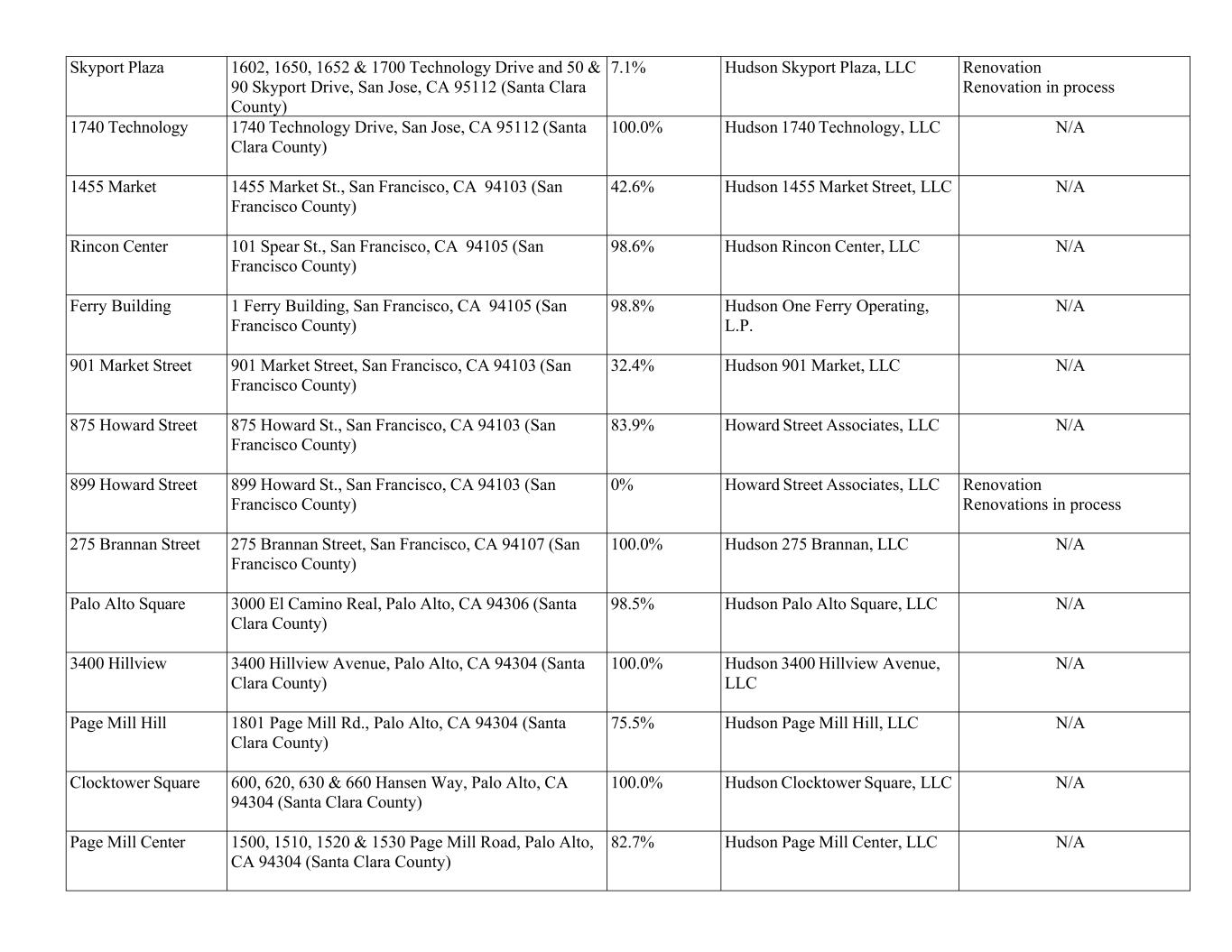 Skyport Plaza 1602, 1650, 1652 & 1700 Technology Drive and 50 & 90 Skyport Drive, San Jose, CA 95112 (Santa Clara County) 7.1% Hudson Skyport Plaza, LLC Renovation Renovation in process 1740 Technology 1740 Technology Drive, San Jose, CA 95112 (Santa Clara County) 100.0% Hudson 1740 Technology, LLC N/A 1455 Market 1455 Market St., San Francisco, CA 94103 (San Francisco County) 42.6% Hudson 1455 Market Street, LLC N/A Rincon Center 101 Spear St., San Francisco, CA 94105 (San Francisco County) 98.6% Hudson Rincon Center, LLC N/A Ferry Building 1 Ferry Building, San Francisco, CA 94105 (San Francisco County) 98.8% Hudson One Ferry Operating, L.P. N/A 901 Market Street 901 Market Street, San Francisco, CA 94103 (San Francisco County) 32.4% Hudson 901 Market, LLC N/A 875 Howard Street 875 Howard St., San Francisco, CA 94103 (San Francisco County) 83.9% Howard Street Associates, LLC N/A 899 Howard Street 899 Howard St., San Francisco, CA 94103 (San Francisco County) 0% Howard Street Associates, LLC Renovation Renovations in process 275 Brannan Street 275 Brannan Street, San Francisco, CA 94107 (San Francisco County) 100.0% Hudson 275 Brannan, LLC N/A Palo Alto Square 3000 El Camino Real, Palo Alto, CA 94306 (Santa Clara County) 98.5% Hudson Palo Alto Square, LLC N/A 3400 Hillview 3400 Hillview Avenue, Palo Alto, CA 94304 (Santa Clara County) 100.0% Hudson 3400 Hillview Avenue, LLC N/A Page Mill Hill 1801 Page Mill Rd., Palo Alto, CA 94304 (Santa Clara County) 75.5% Hudson Page Mill Hill, LLC N/A Clocktower Square 600, 620, 630 & 660 Hansen Way, Palo Alto, CA 94304 (Santa Clara County) 100.0% Hudson Clocktower Square, LLC N/A Page Mill Center 1500, 1510, 1520 & 1530 Page Mill Road, Palo Alto, CA 94304 (Santa Clara County) 82.7% Hudson Page Mill Center, LLC N/A