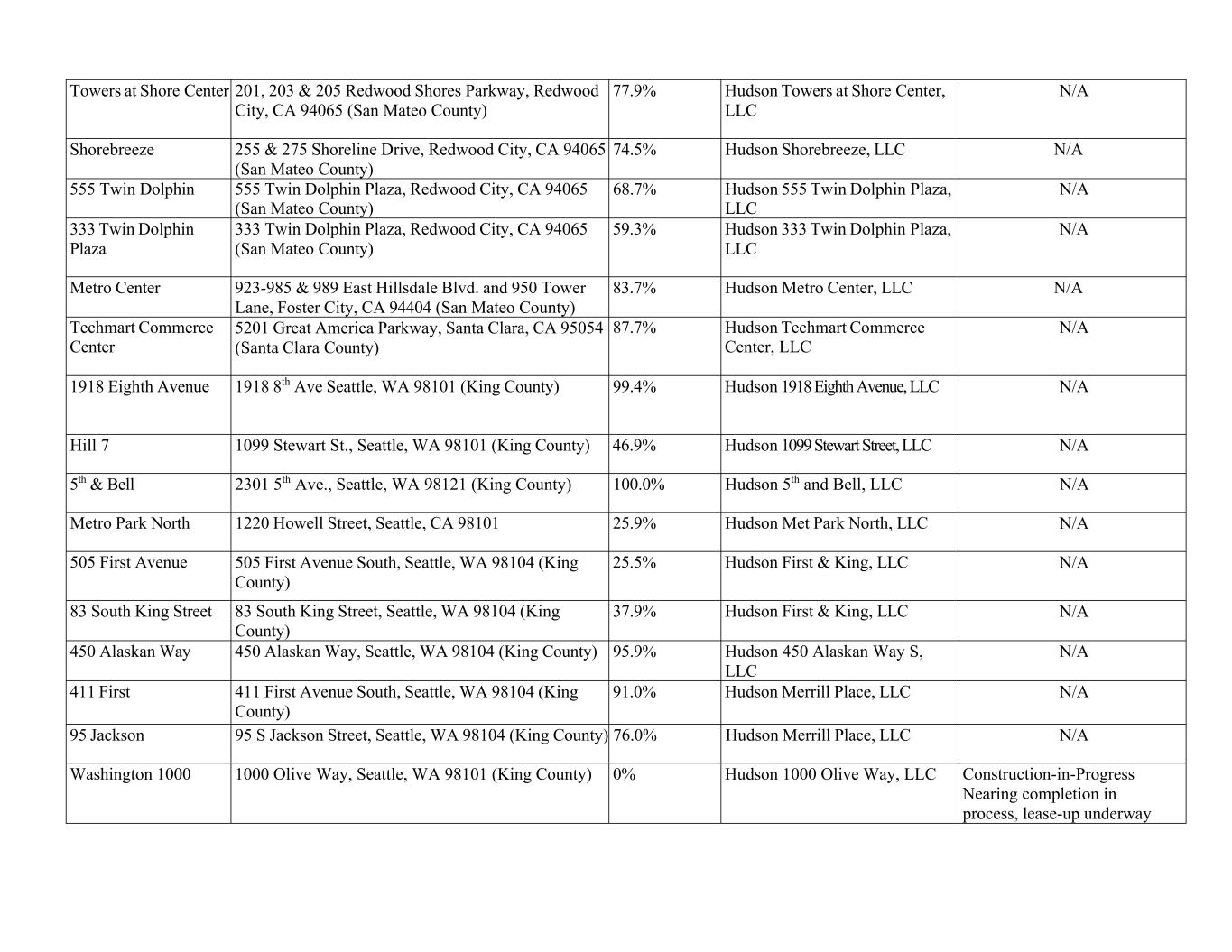 Towers at Shore Center 201, 203 & 205 Redwood Shores Parkway, Redwood City, CA 94065 (San Mateo County) 77.9% Hudson Towers at Shore Center, LLC N/A Shorebreeze 255 & 275 Shoreline Drive, Redwood City, CA 94065 (San Mateo County) 74.5% Hudson Shorebreeze, LLC N/A 555 Twin Dolphin 555 Twin Dolphin Plaza, Redwood City, CA 94065 (San Mateo County) 68.7% Hudson 555 Twin Dolphin Plaza, LLC N/A 333 Twin Dolphin Plaza 333 Twin Dolphin Plaza, Redwood City, CA 94065 (San Mateo County) 59.3% Hudson 333 Twin Dolphin Plaza, LLC N/A Metro Center 923-985 & 989 East Hillsdale Blvd. and 950 Tower Lane, Foster City, CA 94404 (San Mateo County) 83.7% Hudson Metro Center, LLC N/A Techmart Commerce Center 5201 Great America Parkway, Santa Clara, CA 95054 (Santa Clara County) 87.7% Hudson Techmart Commerce Center, LLC N/A 1918 Eighth Avenue 1918 8th Ave Seattle, WA 98101 (King County) 99.4% Hudson 1918 Eighth Avenue, LLC N/A Hill 7 1099 Stewart St., Seattle, WA 98101 (King County) 46.9% Hudson 1099 Stewart Street, LLC N/A 5th & Bell 2301 5th Ave., Seattle, WA 98121 (King County) 100.0% Hudson 5th and Bell, LLC N/A Metro Park North 1220 Howell Street, Seattle, CA 98101 25.9% Hudson Met Park North, LLC N/A 505 First Avenue 505 First Avenue South, Seattle, WA 98104 (King County) 25.5% Hudson First & King, LLC N/A 83 South King Street 83 South King Street, Seattle, WA 98104 (King County) 37.9% Hudson First & King, LLC N/A 450 Alaskan Way 450 Alaskan Way, Seattle, WA 98104 (King County) 95.9% Hudson 450 Alaskan Way S, LLC N/A 411 First 411 First Avenue South, Seattle, WA 98104 (King County) 91.0% Hudson Merrill Place, LLC N/A 95 Jackson 95 S Jackson Street, Seattle, WA 98104 (King County) 76.0% Hudson Merrill Place, LLC N/A Washington 1000 1000 Olive Way, Seattle, WA 98101 (King County) 0% Hudson 1000 Olive Way, LLC Construction-in-Progress Nearing completion in process, lease-up underway