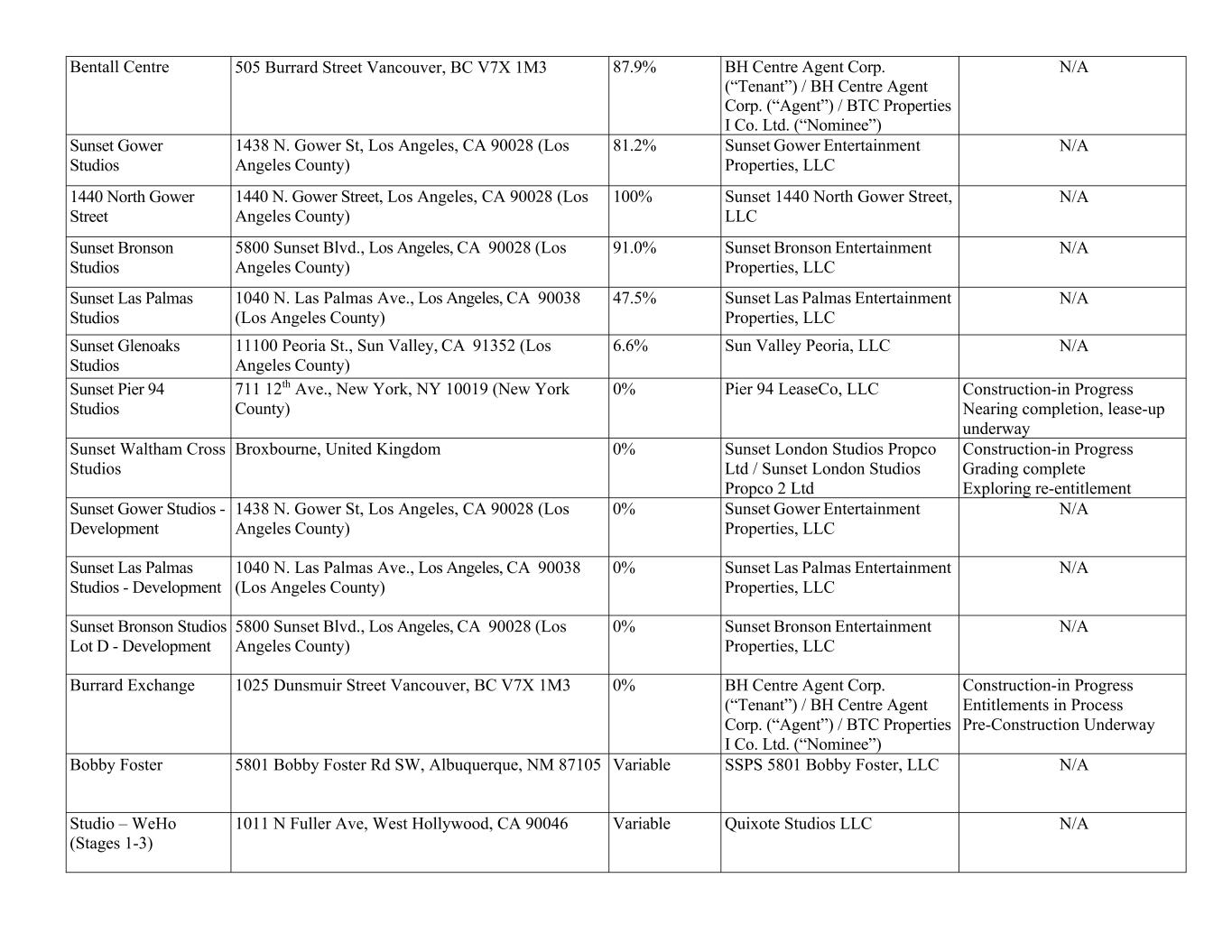Bentall Centre 505 Burrard Street Vancouver, BC V7X 1M3 87.9% BH Centre Agent Corp. (“Tenant”) / BH Centre Agent Corp. (“Agent”) / BTC Properties I Co. Ltd. (“Nominee”) N/A Sunset Gower Studios 1438 N. Gower St, Los Angeles, CA 90028 (Los Angeles County) 81.2% Sunset Gower Entertainment Properties, LLC N/A 1440 North Gower Street 1440 N. Gower Street, Los Angeles, CA 90028 (Los Angeles County) 100% Sunset 1440 North Gower Street, LLC N/A Sunset Bronson Studios 5800 Sunset Blvd., Los Angeles, CA 90028 (Los Angeles County) 91.0% Sunset Bronson Entertainment Properties, LLC N/A Sunset Las Palmas Studios 1040 N. Las Palmas Ave., Los Angeles, CA 90038 (Los Angeles County) 47.5% Sunset Las Palmas Entertainment Properties, LLC N/A Sunset Glenoaks Studios 11100 Peoria St., Sun Valley, CA 91352 (Los Angeles County) 6.6% Sun Valley Peoria, LLC N/A Sunset Pier 94 Studios 711 12th Ave., New York, NY 10019 (New York County) 0% Pier 94 LeaseCo, LLC Construction-in Progress Nearing completion, lease-up underway Sunset Waltham Cross Studios Broxbourne, United Kingdom 0% Sunset London Studios Propco Ltd / Sunset London Studios Propco 2 Ltd Construction-in Progress Grading complete Exploring re-entitlement Sunset Gower Studios - Development 1438 N. Gower St, Los Angeles, CA 90028 (Los Angeles County) 0% Sunset Gower Entertainment Properties, LLC N/A Sunset Las Palmas Studios - Development 1040 N. Las Palmas Ave., Los Angeles, CA 90038 (Los Angeles County) 0% Sunset Las Palmas Entertainment Properties, LLC N/A Sunset Bronson Studios Lot D - Development 5800 Sunset Blvd., Los Angeles, CA 90028 (Los Angeles County) 0% Sunset Bronson Entertainment Properties, LLC N/A Burrard Exchange 1025 Dunsmuir Street Vancouver, BC V7X 1M3 0% BH Centre Agent Corp. (“Tenant”) / BH Centre Agent Corp. (“Agent”) / BTC Properties I Co. Ltd. (“Nominee”) Construction-in Progress Entitlements in Process Pre-Construction Underway Bobby Foster 5801 Bobby Foster Rd SW, Albuquerque, NM 87105 Variable SSPS 5801 Bobby Foster, LLC N/A Studio – WeHo (Stages 1-3) 1011 N Fuller Ave, West Hollywood, CA 90046 Variable Quixote Studios LLC N/A