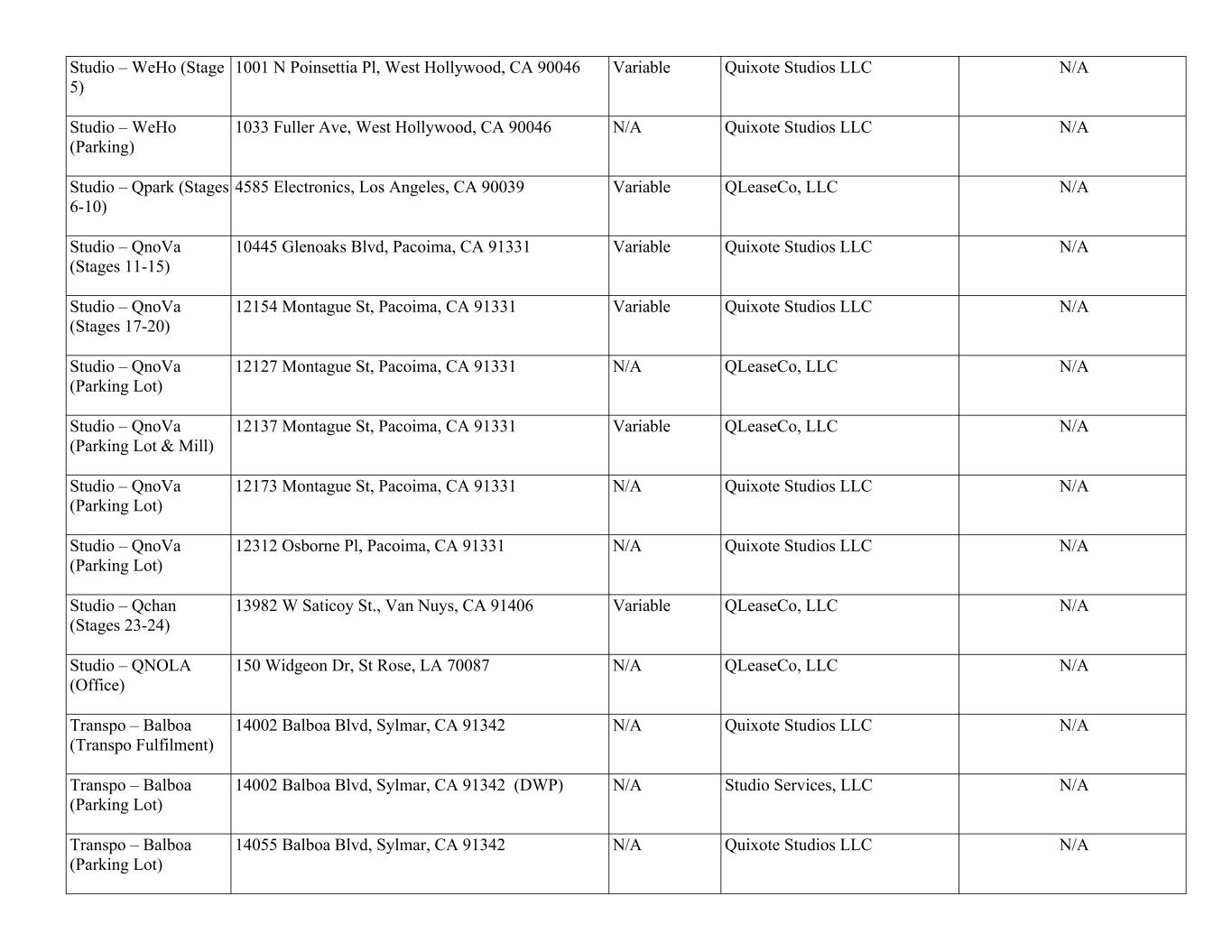 Studio – WeHo (Stage 5) 1001 N Poinsettia Pl, West Hollywood, CA 90046 Variable Quixote Studios LLC N/A Studio – WeHo (Parking) 1033 Fuller Ave, West Hollywood, CA 90046 N/A Quixote Studios LLC N/A Studio – Qpark (Stages 6-10) 4585 Electronics, Los Angeles, CA 90039 Variable QLeaseCo, LLC N/A Studio – QnoVa (Stages 11-15) 10445 Glenoaks Blvd, Pacoima, CA 91331 Variable Quixote Studios LLC N/A Studio – QnoVa (Stages 17-20) 12154 Montague St, Pacoima, CA 91331 Variable Quixote Studios LLC N/A Studio – QnoVa (Parking Lot) 12127 Montague St, Pacoima, CA 91331 N/A QLeaseCo, LLC N/A Studio – QnoVa (Parking Lot & Mill) 12137 Montague St, Pacoima, CA 91331 Variable QLeaseCo, LLC N/A Studio – QnoVa (Parking Lot) 12173 Montague St, Pacoima, CA 91331 N/A Quixote Studios LLC N/A Studio – QnoVa (Parking Lot) 12312 Osborne Pl, Pacoima, CA 91331 N/A Quixote Studios LLC N/A Studio – Qchan (Stages 23-24) 13982 W Saticoy St., Van Nuys, CA 91406 Variable QLeaseCo, LLC N/A Studio – QNOLA (Office) 150 Widgeon Dr, St Rose, LA 70087 N/A QLeaseCo, LLC N/A Transpo – Balboa (Transpo Fulfilment) 14002 Balboa Blvd, Sylmar, CA 91342 N/A Quixote Studios LLC N/A Transpo – Balboa (Parking Lot) 14002 Balboa Blvd, Sylmar, CA 91342 (DWP) N/A Studio Services, LLC N/A Transpo – Balboa (Parking Lot) 14055 Balboa Blvd, Sylmar, CA 91342 N/A Quixote Studios LLC N/A