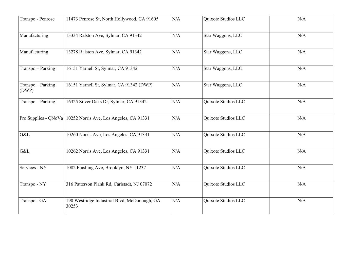Transpo - Penrose 11473 Penrose St, North Hollywood, CA 91605 N/A Quixote Studios LLC N/A Manufacturing 13334 Ralston Ave, Sylmar, CA 91342 N/A Star Waggons, LLC N/A Manufacturing 13278 Ralston Ave, Sylmar, CA 91342 N/A Star Waggons, LLC N/A Transpo – Parking 16151 Yarnell St, Sylmar, CA 91342 N/A Star Waggons, LLC N/A Transpo – Parking (DWP) 16151 Yarnell St, Sylmar, CA 91342 (DWP) N/A Star Waggons, LLC N/A Transpo – Parking 16325 Silver Oaks Dr, Sylmar, CA 91342 N/A Quixote Studios LLC N/A Pro Supplies - QNoVa 10252 Norris Ave, Los Angeles, CA 91331 N/A Quixote Studios LLC N/A G&L 10260 Norris Ave, Los Angeles, CA 91331 N/A Quixote Studios LLC N/A G&L 10262 Norris Ave, Los Angeles, CA 91331 N/A Quixote Studios LLC N/A Services - NY 1082 Flushing Ave, Brooklyn, NY 11237 N/A Quixote Studios LLC N/A Transpo - NY 316 Patterson Plank Rd, Carlstadt, NJ 07072 N/A Quixote Studios LLC N/A Transpo - GA 190 Westridge Industrial Blvd, McDonough, GA 30253 N/A Quixote Studios LLC N/A