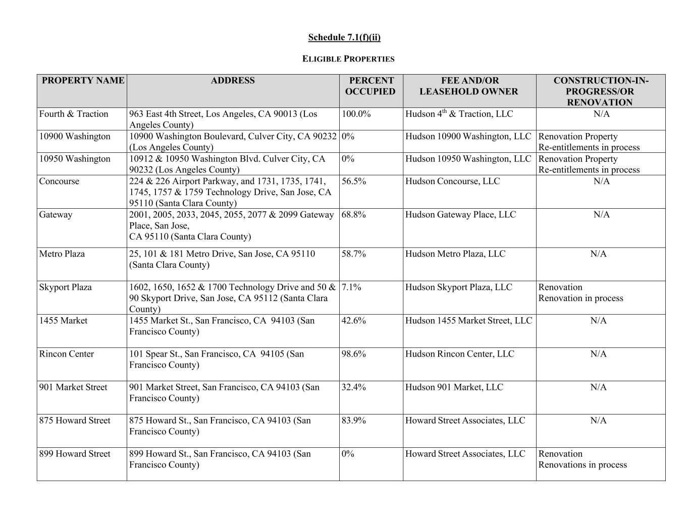 Schedule 7.1(f)(ii) ELIGIBLE PROPERTIES PROPERTY NAME ADDRESS PERCENT OCCUPIED FEE AND/OR LEASEHOLD OWNER CONSTRUCTION-IN- PROGRESS/OR RENOVATION Fourth & Traction 963 East 4th Street, Los Angeles, CA 90013 (Los Angeles County) 100.0% Hudson 4th & Traction, LLC N/A 10900 Washington 10900 Washington Boulevard, Culver City, CA 90232 (Los Angeles County) 0% Hudson 10900 Washington, LLC Renovation Property Re-entitlements in process 10950 Washington 10912 & 10950 Washington Blvd. Culver City, CA 90232 (Los Angeles County) 0% Hudson 10950 Washington, LLC Renovation Property Re-entitlements in process Concourse 224 & 226 Airport Parkway, and 1731, 1735, 1741, 1745, 1757 & 1759 Technology Drive, San Jose, CA 95110 (Santa Clara County) 56.5% Hudson Concourse, LLC N/A Gateway 2001, 2005, 2033, 2045, 2055, 2077 & 2099 Gateway Place, San Jose, CA 95110 (Santa Clara County) 68.8% Hudson Gateway Place, LLC N/A Metro Plaza 25, 101 & 181 Metro Drive, San Jose, CA 95110 (Santa Clara County) 58.7% Hudson Metro Plaza, LLC N/A Skyport Plaza 1602, 1650, 1652 & 1700 Technology Drive and 50 & 90 Skyport Drive, San Jose, CA 95112 (Santa Clara County) 7.1% Hudson Skyport Plaza, LLC Renovation Renovation in process 1455 Market 1455 Market St., San Francisco, CA 94103 (San Francisco County) 42.6% Hudson 1455 Market Street, LLC N/A Rincon Center 101 Spear St., San Francisco, CA 94105 (San Francisco County) 98.6% Hudson Rincon Center, LLC N/A 901 Market Street 901 Market Street, San Francisco, CA 94103 (San Francisco County) 32.4% Hudson 901 Market, LLC N/A 875 Howard Street 875 Howard St., San Francisco, CA 94103 (San Francisco County) 83.9% Howard Street Associates, LLC N/A 899 Howard Street 899 Howard St., San Francisco, CA 94103 (San Francisco County) 0% Howard Street Associates, LLC Renovation Renovations in process