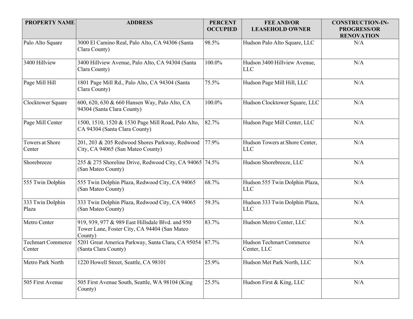PROPERTY NAME ADDRESS PERCENT OCCUPIED FEE AND/OR LEASEHOLD OWNER CONSTRUCTION-IN- PROGRESS/OR RENOVATION Palo Alto Square 3000 El Camino Real, Palo Alto, CA 94306 (Santa Clara County) 98.5% Hudson Palo Alto Square, LLC N/A 3400 Hillview 3400 Hillview Avenue, Palo Alto, CA 94304 (Santa Clara County) 100.0% Hudson 3400 Hillview Avenue, LLC N/A Page Mill Hill 1801 Page Mill Rd., Palo Alto, CA 94304 (Santa Clara County) 75.5% Hudson Page Mill Hill, LLC N/A Clocktower Square 600, 620, 630 & 660 Hansen Way, Palo Alto, CA 94304 (Santa Clara County) 100.0% Hudson Clocktower Square, LLC N/A Page Mill Center 1500, 1510, 1520 & 1530 Page Mill Road, Palo Alto, CA 94304 (Santa Clara County) 82.7% Hudson Page Mill Center, LLC N/A Towers at Shore Center 201, 203 & 205 Redwood Shores Parkway, Redwood City, CA 94065 (San Mateo County) 77.9% Hudson Towers at Shore Center, LLC N/A Shorebreeze 255 & 275 Shoreline Drive, Redwood City, CA 94065 (San Mateo County) 74.5% Hudson Shorebreeze, LLC N/A 555 Twin Dolphin 555 Twin Dolphin Plaza, Redwood City, CA 94065 (San Mateo County) 68.7% Hudson 555 Twin Dolphin Plaza, LLC N/A 333 Twin Dolphin Plaza 333 Twin Dolphin Plaza, Redwood City, CA 94065 (San Mateo County) 59.3% Hudson 333 Twin Dolphin Plaza, LLC N/A Metro Center 919, 939, 977 & 989 East Hillsdale Blvd. and 950 Tower Lane, Foster City, CA 94404 (San Mateo County) 83.7% Hudson Metro Center, LLC N/A Techmart Commerce Center 5201 Great America Parkway, Santa Clara, CA 95054 (Santa Clara County) 87.7% Hudson Techmart Commerce Center, LLC N/A Metro Park North 1220 Howell Street, Seattle, CA 98101 25.9% Hudson Met Park North, LLC N/A 505 First Avenue 505 First Avenue South, Seattle, WA 98104 (King County) 25.5% Hudson First & King, LLC N/A