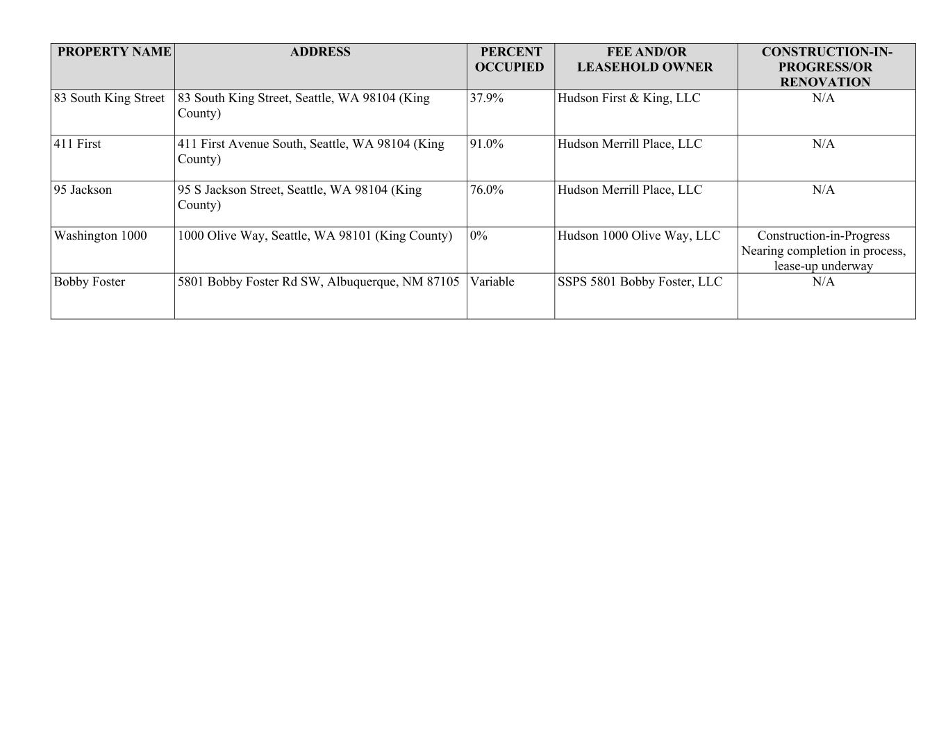 PROPERTY NAME ADDRESS PERCENT OCCUPIED FEE AND/OR LEASEHOLD OWNER CONSTRUCTION-IN- PROGRESS/OR RENOVATION 83 South King Street 83 South King Street, Seattle, WA 98104 (King County) 37.9% Hudson First & King, LLC N/A 411 First 411 First Avenue South, Seattle, WA 98104 (King County) 91.0% Hudson Merrill Place, LLC N/A 95 Jackson 95 S Jackson Street, Seattle, WA 98104 (King County) 76.0% Hudson Merrill Place, LLC N/A Washington 1000 1000 Olive Way, Seattle, WA 98101 (King County) 0% Hudson 1000 Olive Way, LLC Construction-in-Progress Nearing completion in process, lease-up underway Bobby Foster 5801 Bobby Foster Rd SW, Albuquerque, NM 87105 Variable SSPS 5801 Bobby Foster, LLC N/A