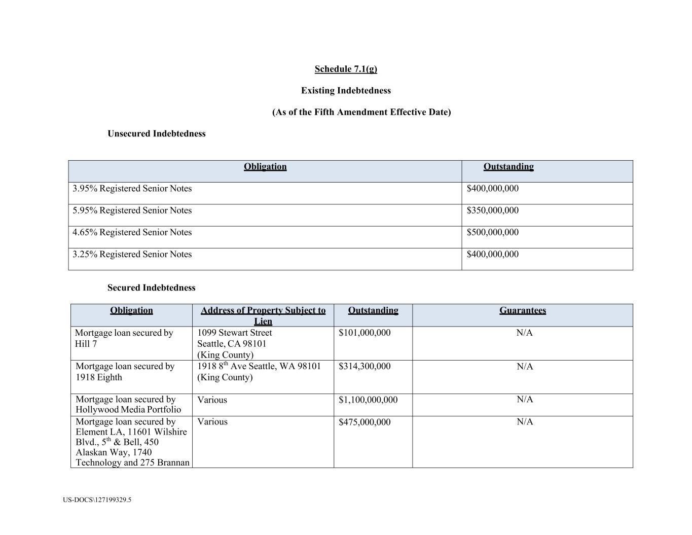 US-DOCS\127199329.5 Schedule 7.1(g) Existing Indebtedness (As of the Fifth Amendment Effective Date) Unsecured Indebtedness Obligation Outstanding 3.95% Registered Senior Notes $400,000,000 5.95% Registered Senior Notes $350,000,000 4.65% Registered Senior Notes $500,000,000 3.25% Registered Senior Notes $400,000,000 Secured Indebtedness Obligation Address of Property Subject to Lien Outstanding Guarantees Mortgage loan secured by Hill 7 1099 Stewart Street Seattle, CA 98101 (King County) $101,000,000 N/A Mortgage loan secured by 1918 Eighth 1918 8th Ave Seattle, WA 98101 (King County) $314,300,000 N/A Mortgage loan secured by Hollywood Media Portfolio Various $1,100,000,000 N/A Mortgage loan secured by Element LA, 11601 Wilshire Blvd., 5th & Bell, 450 Alaskan Way, 1740 Technology and 275 Brannan Various $475,000,000 N/A