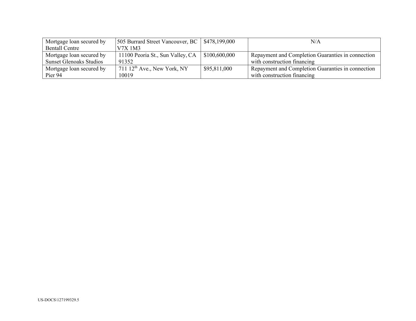 US-DOCS\127199329.5 Mortgage loan secured by Bentall Centre 505 Burrard Street Vancouver, BC V7X 1M3 $478,199,000 N/A Mortgage loan secured by Sunset Glenoaks Studios 11100 Peoria St., Sun Valley, CA 91352 $100,600,000 Repayment and Completion Guaranties in connection with construction financing Mortgage loan secured by Pier 94 711 12th Ave., New York, NY 10019 $95,811,000 Repayment and Completion Guaranties in connection with construction financing