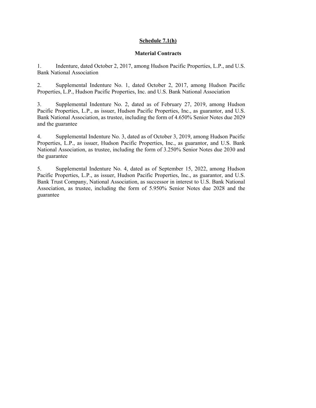 Schedule 7.1(h) Material Contracts 1. Indenture, dated October 2, 2017, among Hudson Pacific Properties, L.P., and U.S. Bank National Association 2. Supplemental Indenture No. 1, dated October 2, 2017, among Hudson Pacific Properties, L.P., Hudson Pacific Properties, Inc. and U.S. Bank National Association 3. Supplemental Indenture No. 2, dated as of February 27, 2019, among Hudson Pacific Properties, L.P., as issuer, Hudson Pacific Properties, Inc., as guarantor, and U.S. Bank National Association, as trustee, including the form of 4.650% Senior Notes due 2029 and the guarantee 4. Supplemental Indenture No. 3, dated as of October 3, 2019, among Hudson Pacific Properties, L.P., as issuer, Hudson Pacific Properties, Inc., as guarantor, and U.S. Bank National Association, as trustee, including the form of 3.250% Senior Notes due 2030 and the guarantee 5. Supplemental Indenture No. 4, dated as of September 15, 2022, among Hudson Pacific Properties, L.P., as issuer, Hudson Pacific Properties, Inc., as guarantor, and U.S. Bank Trust Company, National Association, as successor in interest to U.S. Bank National Association, as trustee, including the form of 5.950% Senior Notes due 2028 and the guarantee