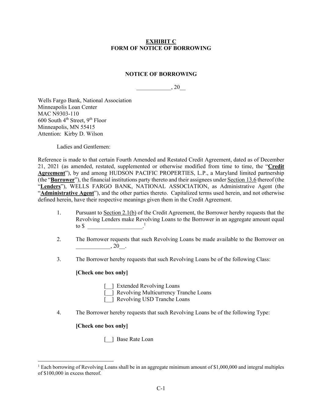 C-1 EXHIBIT C FORM OF NOTICE OF BORROWING NOTICE OF BORROWING ____________, 20__ Wells Fargo Bank, National Association Minneapolis Loan Center MAC N9303-110 600 South 4th Street, 9th Floor Minneapolis, MN 55415 Attention: Kirby D. Wilson Ladies and Gentlemen: Reference is made to that certain Fourth Amended and Restated Credit Agreement, dated as of December 21, 2021 (as amended, restated, supplemented or otherwise modified from time to time, the “Credit Agreement”), by and among HUDSON PACIFIC PROPERTIES, L.P., a Maryland limited partnership (the “Borrower”), the financial institutions party thereto and their assignees under Section 13.6 thereof (the “Lenders”), WELLS FARGO BANK, NATIONAL ASSOCIATION, as Administrative Agent (the “Administrative Agent”), and the other parties thereto. Capitalized terms used herein, and not otherwise defined herein, have their respective meanings given them in the Credit Agreement. 1. Pursuant to Section 2.1(b) of the Credit Agreement, the Borrower hereby requests that the Revolving Lenders make Revolving Loans to the Borrower in an aggregate amount equal to $ ___________________.1 2. The Borrower requests that such Revolving Loans be made available to the Borrower on ____________, 20__. 3. The Borrower hereby requests that such Revolving Loans be of the following Class: [Check one box only] [__] Extended Revolving Loans [__] Revolving Multicurrency Tranche Loans [__] Revolving USD Tranche Loans 4. The Borrower hereby requests that such Revolving Loans be of the following Type: [Check one box only] [__] Base Rate Loan 1 Each borrowing of Revolving Loans shall be in an aggregate minimum amount of $1,000,000 and integral multiples of $100,000 in excess thereof.