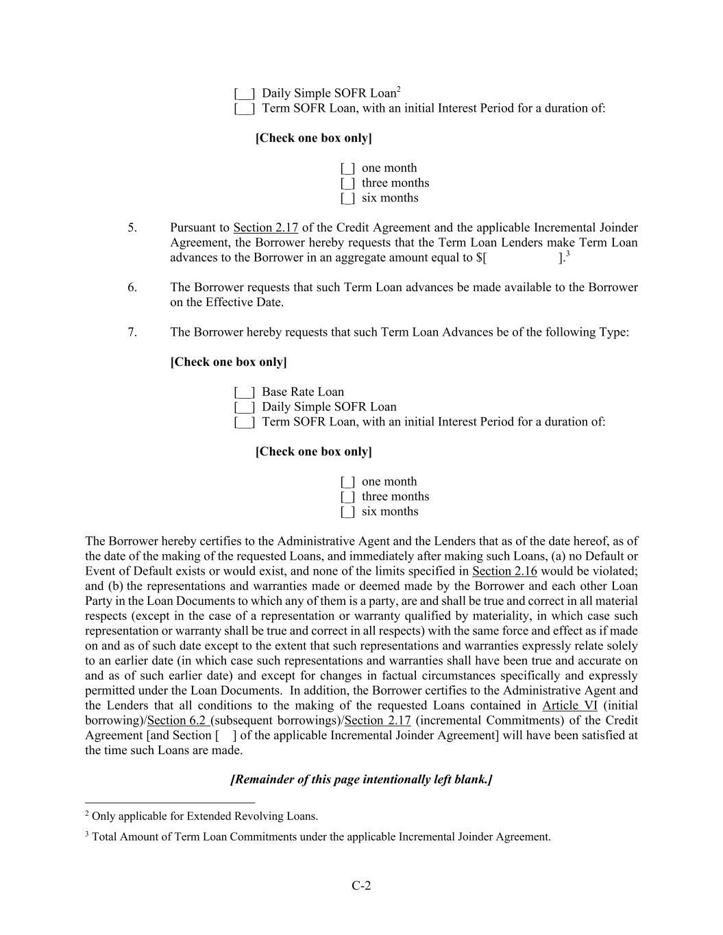 C-2 [__] Daily Simple SOFR Loan2 [__] Term SOFR Loan, with an initial Interest Period for a duration of: [Check one box only] [_] one month [_] three months [_] six months 5. Pursuant to Section 2.17 of the Credit Agreement and the applicable Incremental Joinder Agreement, the Borrower hereby requests that the Term Loan Lenders make Term Loan advances to the Borrower in an aggregate amount equal to $[ ].3 6. The Borrower requests that such Term Loan advances be made available to the Borrower on the Effective Date. 7. The Borrower hereby requests that such Term Loan Advances be of the following Type: [Check one box only] [__] Base Rate Loan [__] Daily Simple SOFR Loan [__] Term SOFR Loan, with an initial Interest Period for a duration of: [Check one box only] [_] one month [_] three months [_] six months The Borrower hereby certifies to the Administrative Agent and the Lenders that as of the date hereof, as of the date of the making of the requested Loans, and immediately after making such Loans, (a) no Default or Event of Default exists or would exist, and none of the limits specified in Section 2.16 would be violated; and (b) the representations and warranties made or deemed made by the Borrower and each other Loan Party in the Loan Documents to which any of them is a party, are and shall be true and correct in all material respects (except in the case of a representation or warranty qualified by materiality, in which case such representation or warranty shall be true and correct in all respects) with the same force and effect as if made on and as of such date except to the extent that such representations and warranties expressly relate solely to an earlier date (in which case such representations and warranties shall have been true and accurate on and as of such earlier date) and except for changes in factual circumstances specifically and expressly permitted under the Loan Documents. In addition, the Borrower certifies to the Administrative Agent and the Lenders that all conditions to the making of the requested Loans contained in Article VI (initial borrowing)/Section 6.2 (subsequent borrowings)/Section 2.17 (incremental Commitments) of the Credit Agreement [and Section [ ] of the applicable Incremental Joinder Agreement] will have been satisfied at the time such Loans are made. [Remainder of this page intentionally left blank.] 2 Only applicable for Extended Revolving Loans. 3 Total Amount of Term Loan Commitments under the applicable Incremental Joinder Agreement.