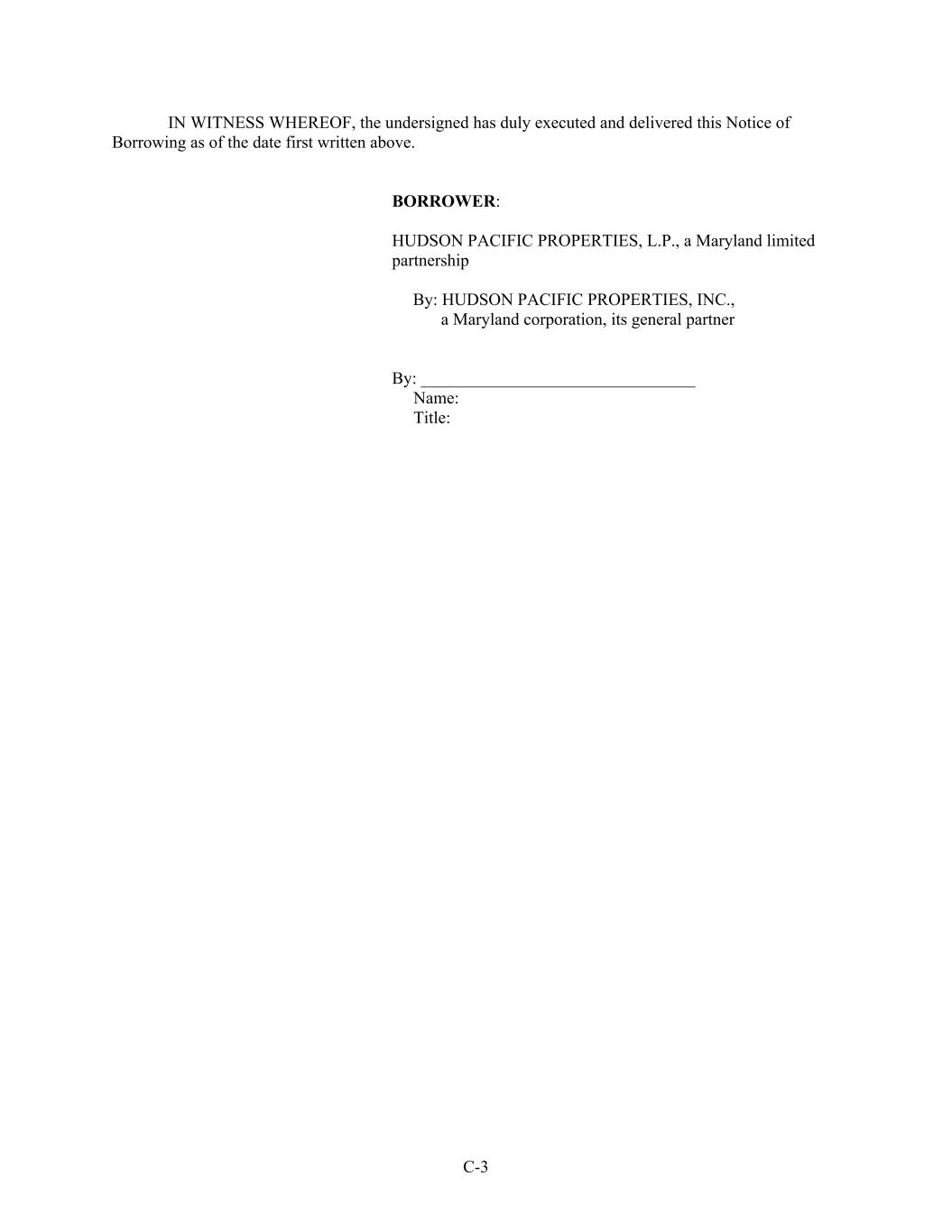 C-3 IN WITNESS WHEREOF, the undersigned has duly executed and delivered this Notice of Borrowing as of the date first written above. BORROWER: HUDSON PACIFIC PROPERTIES, L.P., a Maryland limited partnership By: HUDSON PACIFIC PROPERTIES, INC., a Maryland corporation, its general partner By: ________________________________ Name: Title: