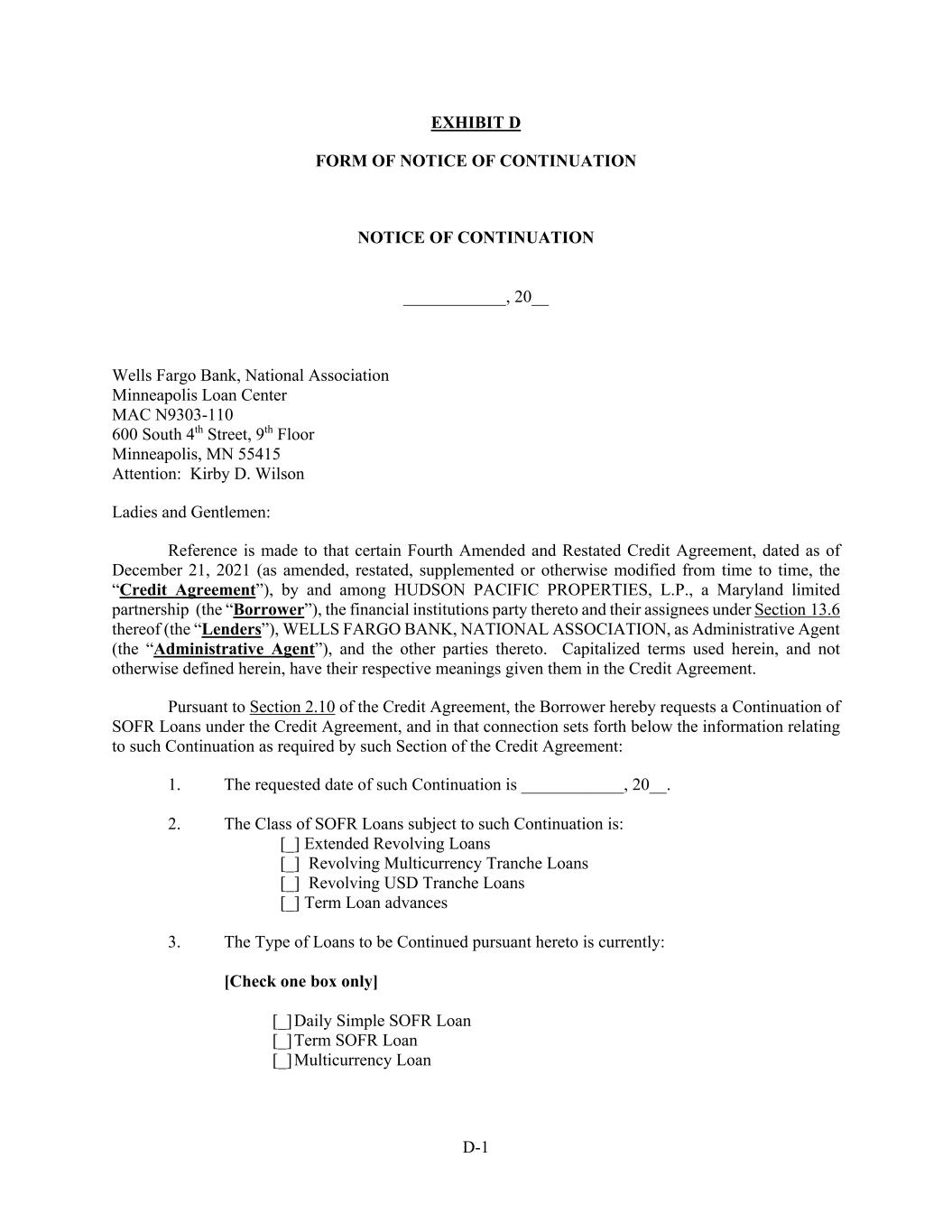 D-1 EXHIBIT D FORM OF NOTICE OF CONTINUATION NOTICE OF CONTINUATION ____________, 20__ Wells Fargo Bank, National Association Minneapolis Loan Center MAC N9303-110 600 South 4th Street, 9th Floor Minneapolis, MN 55415 Attention: Kirby D. Wilson Ladies and Gentlemen: Reference is made to that certain Fourth Amended and Restated Credit Agreement, dated as of December 21, 2021 (as amended, restated, supplemented or otherwise modified from time to time, the “Credit Agreement”), by and among HUDSON PACIFIC PROPERTIES, L.P., a Maryland limited partnership (the “Borrower”), the financial institutions party thereto and their assignees under Section 13.6 thereof (the “Lenders”), WELLS FARGO BANK, NATIONAL ASSOCIATION, as Administrative Agent (the “Administrative Agent”), and the other parties thereto. Capitalized terms used herein, and not otherwise defined herein, have their respective meanings given them in the Credit Agreement. Pursuant to Section 2.10 of the Credit Agreement, the Borrower hereby requests a Continuation of SOFR Loans under the Credit Agreement, and in that connection sets forth below the information relating to such Continuation as required by such Section of the Credit Agreement: 1. The requested date of such Continuation is ____________, 20__. 2. The Class of SOFR Loans subject to such Continuation is: [_] Extended Revolving Loans [_] Revolving Multicurrency Tranche Loans [_] Revolving USD Tranche Loans [_] Term Loan advances 3. The Type of Loans to be Continued pursuant hereto is currently: [Check one box only] [_] Daily Simple SOFR Loan [_] Term SOFR Loan [_] Multicurrency Loan