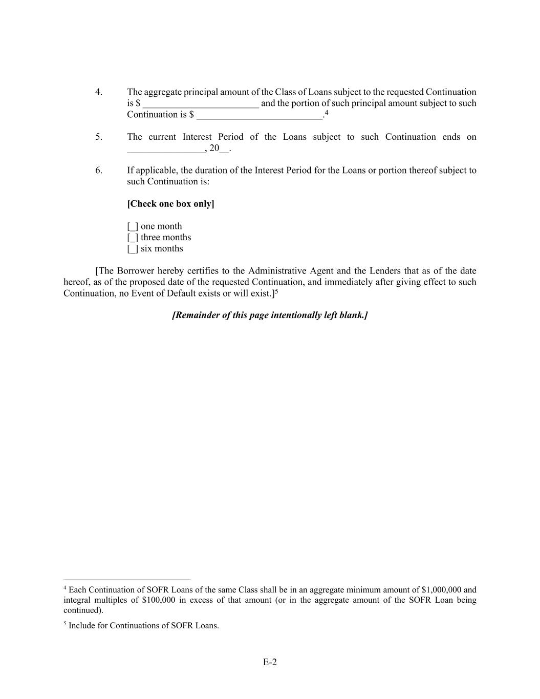 E-2 4. The aggregate principal amount of the Class of Loans subject to the requested Continuation is $ ________________________ and the portion of such principal amount subject to such Continuation is $ __________________________.4 5. The current Interest Period of the Loans subject to such Continuation ends on ________________, 20__. 6. If applicable, the duration of the Interest Period for the Loans or portion thereof subject to such Continuation is: [Check one box only] [_] one month [_] three months [_] six months [The Borrower hereby certifies to the Administrative Agent and the Lenders that as of the date hereof, as of the proposed date of the requested Continuation, and immediately after giving effect to such Continuation, no Event of Default exists or will exist.]5 [Remainder of this page intentionally left blank.] 4 Each Continuation of SOFR Loans of the same Class shall be in an aggregate minimum amount of $1,000,000 and integral multiples of $100,000 in excess of that amount (or in the aggregate amount of the SOFR Loan being continued). 5 Include for Continuations of SOFR Loans.