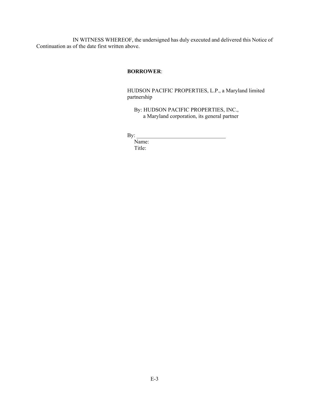 E-3 IN WITNESS WHEREOF, the undersigned has duly executed and delivered this Notice of Continuation as of the date first written above. BORROWER: HUDSON PACIFIC PROPERTIES, L.P., a Maryland limited partnership By: HUDSON PACIFIC PROPERTIES, INC., a Maryland corporation, its general partner By: ________________________________ Name: Title: