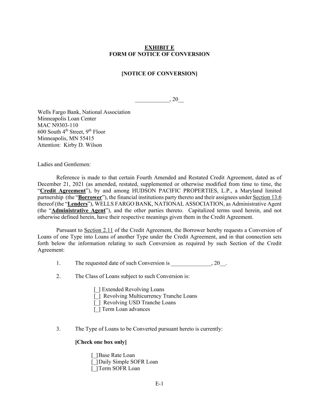 E-1 EXHIBIT E FORM OF NOTICE OF CONVERSION [NOTICE OF CONVERSION] ____________, 20__ Wells Fargo Bank, National Association Minneapolis Loan Center MAC N9303-110 600 South 4th Street, 9th Floor Minneapolis, MN 55415 Attention: Kirby D. Wilson Ladies and Gentlemen: Reference is made to that certain Fourth Amended and Restated Credit Agreement, dated as of December 21, 2021 (as amended, restated, supplemented or otherwise modified from time to time, the “Credit Agreement”), by and among HUDSON PACIFIC PROPERTIES, L.P., a Maryland limited partnership (the “Borrower”), the financial institutions party thereto and their assignees under Section 13.6 thereof (the “Lenders”), WELLS FARGO BANK, NATIONAL ASSOCIATION, as Administrative Agent (the “Administrative Agent”), and the other parties thereto. Capitalized terms used herein, and not otherwise defined herein, have their respective meanings given them in the Credit Agreement. Pursuant to Section 2.11 of the Credit Agreement, the Borrower hereby requests a Conversion of Loans of one Type into Loans of another Type under the Credit Agreement, and in that connection sets forth below the information relating to such Conversion as required by such Section of the Credit Agreement: 1. The requested date of such Conversion is ______________, 20__. 2. The Class of Loans subject to such Conversion is: [_] Extended Revolving Loans [_] Revolving Multicurrency Tranche Loans [_] Revolving USD Tranche Loans [_] Term Loan advances 3. The Type of Loans to be Converted pursuant hereto is currently: [Check one box only] [_] Base Rate Loan [_] Daily Simple SOFR Loan [_] Term SOFR Loan