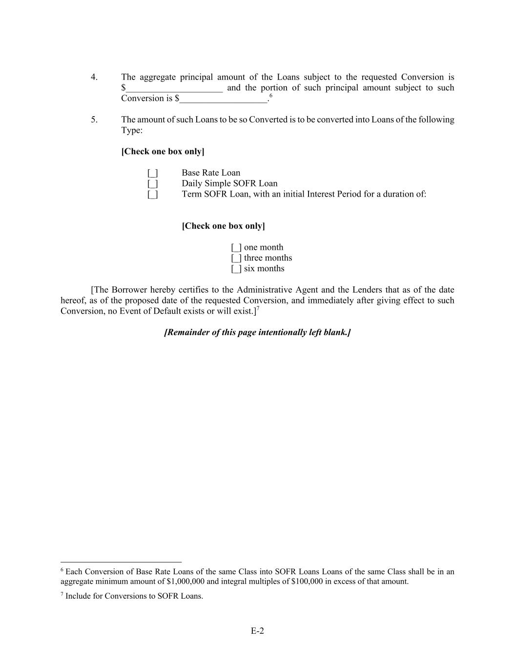 E-2 4. The aggregate principal amount of the Loans subject to the requested Conversion is $_____________________ and the portion of such principal amount subject to such Conversion is $___________________.6 5. The amount of such Loans to be so Converted is to be converted into Loans of the following Type: [Check one box only] [_] Base Rate Loan [_] Daily Simple SOFR Loan [_] Term SOFR Loan, with an initial Interest Period for a duration of: [Check one box only] [_] one month [_] three months [_] six months [The Borrower hereby certifies to the Administrative Agent and the Lenders that as of the date hereof, as of the proposed date of the requested Conversion, and immediately after giving effect to such Conversion, no Event of Default exists or will exist.]7 [Remainder of this page intentionally left blank.] 6 Each Conversion of Base Rate Loans of the same Class into SOFR Loans Loans of the same Class shall be in an aggregate minimum amount of $1,000,000 and integral multiples of $100,000 in excess of that amount. 7 Include for Conversions to SOFR Loans.