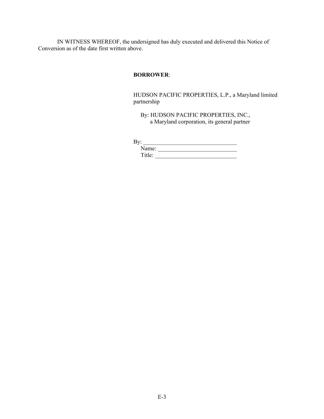 E-3 IN WITNESS WHEREOF, the undersigned has duly executed and delivered this Notice of Conversion as of the date first written above. BORROWER: HUDSON PACIFIC PROPERTIES, L.P., a Maryland limited partnership By: HUDSON PACIFIC PROPERTIES, INC., a Maryland corporation, its general partner By: ________________________________ Name: ___________________________ Title: ____________________________