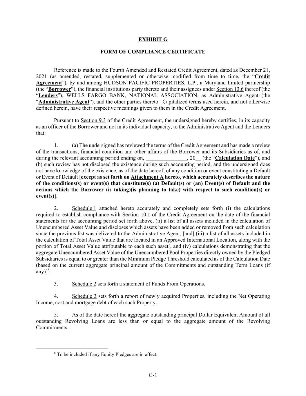 G-1 EXHIBIT G FORM OF COMPLIANCE CERTIFICATE Reference is made to the Fourth Amended and Restated Credit Agreement, dated as December 21, 2021 (as amended, restated, supplemented or otherwise modified from time to time, the “Credit Agreement”), by and among HUDSON PACIFIC PROPERTIES, L.P., a Maryland limited partnership (the “Borrower”), the financial institutions party thereto and their assignees under Section 13.6 thereof (the “Lenders”), WELLS FARGO BANK, NATIONAL ASSOCIATION, as Administrative Agent (the “Administrative Agent”), and the other parties thereto. Capitalized terms used herein, and not otherwise defined herein, have their respective meanings given to them in the Credit Agreement. Pursuant to Section 9.3 of the Credit Agreement, the undersigned hereby certifies, in its capacity as an officer of the Borrower and not in its individual capacity, to the Administrative Agent and the Lenders that: 1. (a) The undersigned has reviewed the terms of the Credit Agreement and has made a review of the transactions, financial condition and other affairs of the Borrower and its Subsidiaries as of, and during the relevant accounting period ending on, _______________, 20__ (the “Calculation Date”), and (b) such review has not disclosed the existence during such accounting period, and the undersigned does not have knowledge of the existence, as of the date hereof, of any condition or event constituting a Default or Event of Default [except as set forth on Attachment A hereto, which accurately describes the nature of the conditions(s) or event(s) that constitute(s) (a) Default(s) or (an) Event(s) of Default and the actions which the Borrower (is taking)(is planning to take) with respect to such condition(s) or event(s)]. 2. Schedule 1 attached hereto accurately and completely sets forth (i) the calculations required to establish compliance with Section 10.1 of the Credit Agreement on the date of the financial statements for the accounting period set forth above, (ii) a list of all assets included in the calculation of Unencumbered Asset Value and discloses which assets have been added or removed from such calculation since the previous list was delivered to the Administrative Agent, [and] (iii) a list of all assets included in the calculation of Total Asset Value that are located in an Approved International Location, along with the portion of Total Asset Value attributable to each such asset[, and (iv) calculations demonstrating that the aggregate Unencumbered Asset Value of the Unencumbered Pool Properties directly owned by the Pledged Subsidiaries is equal to or greater than the Minimum Pledge Threshold calculated as of the Calculation Date (based on the current aggregate principal amount of the Commitments and outstanding Term Loans (if any)]8. 3. Schedule 2 sets forth a statement of Funds From Operations. 4. Schedule 3 sets forth a report of newly acquired Properties, including the Net Operating Income, cost and mortgage debt of each such Property. 5. As of the date hereof the aggregate outstanding principal Dollar Equivalent Amount of all outstanding Revolving Loans are less than or equal to the aggregate amount of the Revolving Commitments. 8 To be included if any Equity Pledges are in effect.
