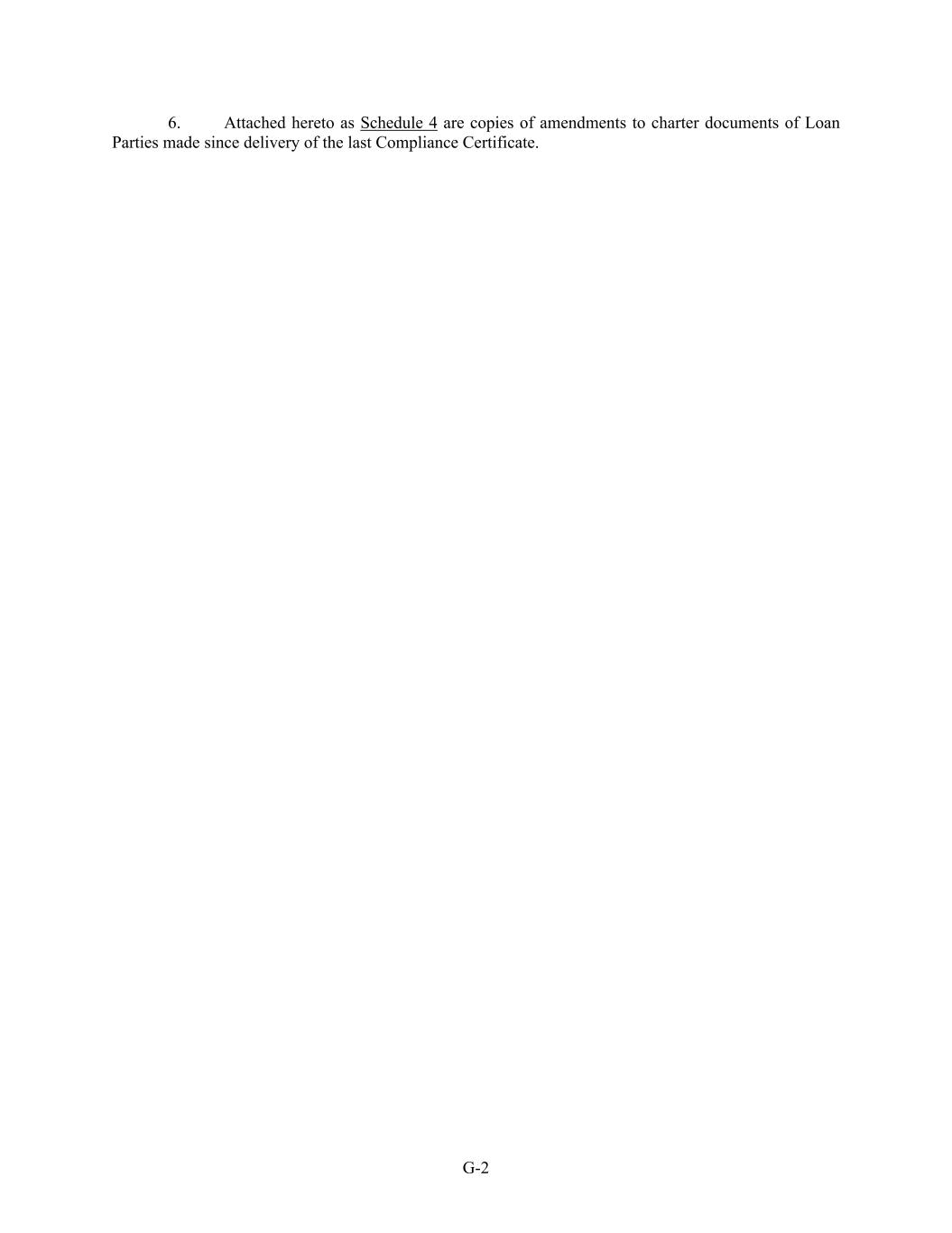 G-2 6. Attached hereto as Schedule 4 are copies of amendments to charter documents of Loan Parties made since delivery of the last Compliance Certificate.