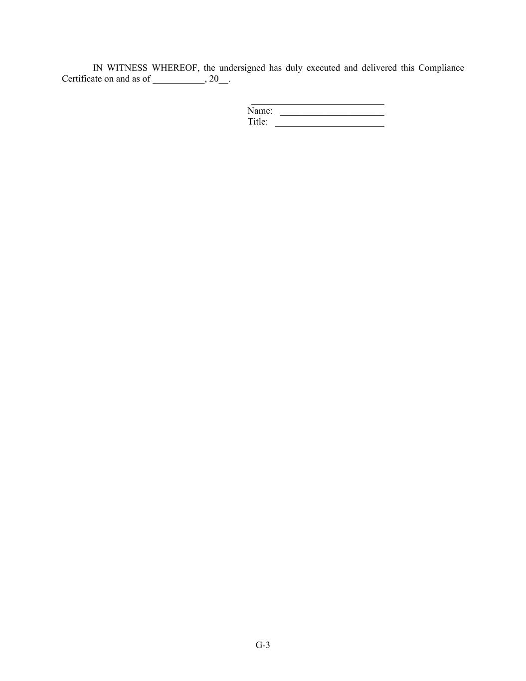 G-3 IN WITNESS WHEREOF, the undersigned has duly executed and delivered this Compliance Certificate on and as of ___________, 20__. ____________________________ Name: ______________________ Title: _______________________