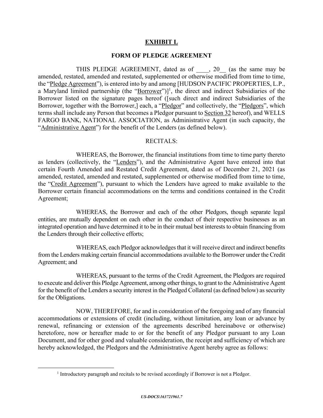 US-DOCS\163721961.7 EXHIBIT L FORM OF PLEDGE AGREEMENT THIS PLEDGE AGREEMENT, dated as of ____, 20__ (as the same may be amended, restated, amended and restated, supplemented or otherwise modified from time to time, the “Pledge Agreement”), is entered into by and among [HUDSON PACIFIC PROPERTIES, L.P., a Maryland limited partnership (the “Borrower”)]1, the direct and indirect Subsidiaries of the Borrower listed on the signature pages hereof ([such direct and indirect Subsidiaries of the Borrower, together with the Borrower,] each, a “Pledgor” and collectively, the “Pledgors”, which terms shall include any Person that becomes a Pledgor pursuant to Section 32 hereof), and WELLS FARGO BANK, NATIONAL ASSOCIATION, as Administrative Agent (in such capacity, the “Administrative Agent”) for the benefit of the Lenders (as defined below). RECITALS: WHEREAS, the Borrower, the financial institutions from time to time party thereto as lenders (collectively, the “Lenders”), and the Administrative Agent have entered into that certain Fourth Amended and Restated Credit Agreement, dated as of December 21, 2021 (as amended, restated, amended and restated, supplemented or otherwise modified from time to time, the “Credit Agreement”), pursuant to which the Lenders have agreed to make available to the Borrower certain financial accommodations on the terms and conditions contained in the Credit Agreement; WHEREAS, the Borrower and each of the other Pledgors, though separate legal entities, are mutually dependent on each other in the conduct of their respective businesses as an integrated operation and have determined it to be in their mutual best interests to obtain financing from the Lenders through their collective efforts; WHEREAS, each Pledgor acknowledges that it will receive direct and indirect benefits from the Lenders making certain financial accommodations available to the Borrower under the Credit Agreement; and WHEREAS, pursuant to the terms of the Credit Agreement, the Pledgors are required to execute and deliver this Pledge Agreement, among other things, to grant to the Administrative Agent for the benefit of the Lenders a security interest in the Pledged Collateral (as defined below) as security for the Obligations. NOW, THEREFORE, for and in consideration of the foregoing and of any financial accommodations or extensions of credit (including, without limitation, any loan or advance by renewal, refinancing or extension of the agreements described hereinabove or otherwise) heretofore, now or hereafter made to or for the benefit of any Pledgor pursuant to any Loan Document, and for other good and valuable consideration, the receipt and sufficiency of which are hereby acknowledged, the Pledgors and the Administrative Agent hereby agree as follows: 1 Introductory paragraph and recitals to be revised accordingly if Borrower is not a Pledgor.