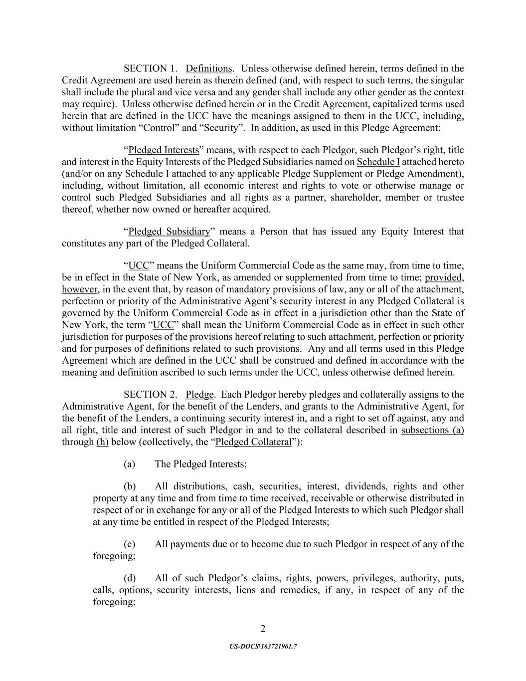 2 US-DOCS\163721961.7 SECTION 1. Definitions. Unless otherwise defined herein, terms defined in the Credit Agreement are used herein as therein defined (and, with respect to such terms, the singular shall include the plural and vice versa and any gender shall include any other gender as the context may require). Unless otherwise defined herein or in the Credit Agreement, capitalized terms used herein that are defined in the UCC have the meanings assigned to them in the UCC, including, without limitation “Control” and “Security”. In addition, as used in this Pledge Agreement: “Pledged Interests” means, with respect to each Pledgor, such Pledgor’s right, title and interest in the Equity Interests of the Pledged Subsidiaries named on Schedule I attached hereto (and/or on any Schedule I attached to any applicable Pledge Supplement or Pledge Amendment), including, without limitation, all economic interest and rights to vote or otherwise manage or control such Pledged Subsidiaries and all rights as a partner, shareholder, member or trustee thereof, whether now owned or hereafter acquired. “Pledged Subsidiary” means a Person that has issued any Equity Interest that constitutes any part of the Pledged Collateral. “UCC” means the Uniform Commercial Code as the same may, from time to time, be in effect in the State of New York, as amended or supplemented from time to time; provided, however, in the event that, by reason of mandatory provisions of law, any or all of the attachment, perfection or priority of the Administrative Agent’s security interest in any Pledged Collateral is governed by the Uniform Commercial Code as in effect in a jurisdiction other than the State of New York, the term “UCC” shall mean the Uniform Commercial Code as in effect in such other jurisdiction for purposes of the provisions hereof relating to such attachment, perfection or priority and for purposes of definitions related to such provisions. Any and all terms used in this Pledge Agreement which are defined in the UCC shall be construed and defined in accordance with the meaning and definition ascribed to such terms under the UCC, unless otherwise defined herein. SECTION 2. Pledge. Each Pledgor hereby pledges and collaterally assigns to the Administrative Agent, for the benefit of the Lenders, and grants to the Administrative Agent, for the benefit of the Lenders, a continuing security interest in, and a right to set off against, any and all right, title and interest of such Pledgor in and to the collateral described in subsections (a) through (h) below (collectively, the “Pledged Collateral”): (a) The Pledged Interests; (b) All distributions, cash, securities, interest, dividends, rights and other property at any time and from time to time received, receivable or otherwise distributed in respect of or in exchange for any or all of the Pledged Interests to which such Pledgor shall at any time be entitled in respect of the Pledged Interests; (c) All payments due or to become due to such Pledgor in respect of any of the foregoing; (d) All of such Pledgor’s claims, rights, powers, privileges, authority, puts, calls, options, security interests, liens and remedies, if any, in respect of any of the foregoing;