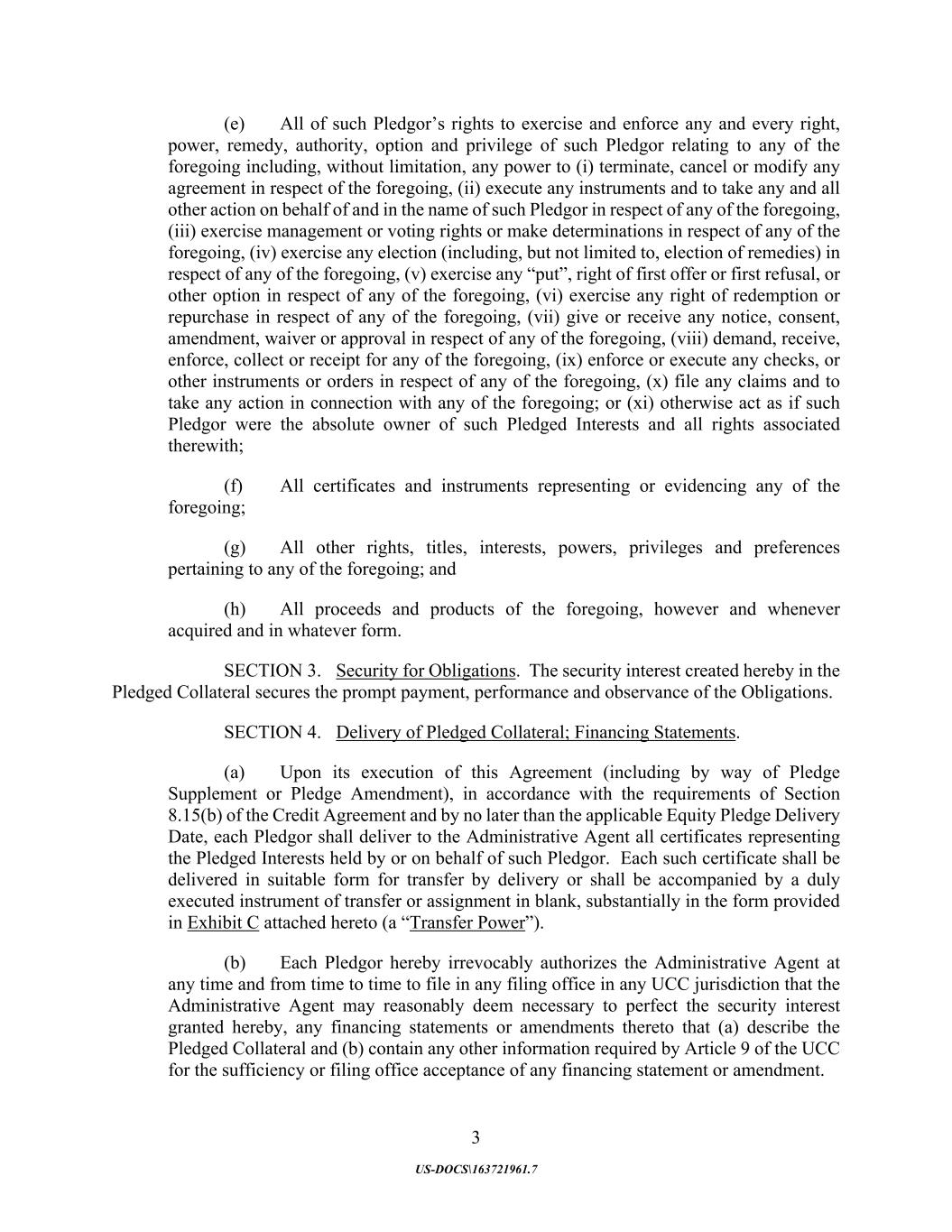 3 US-DOCS\163721961.7 (e) All of such Pledgor’s rights to exercise and enforce any and every right, power, remedy, authority, option and privilege of such Pledgor relating to any of the foregoing including, without limitation, any power to (i) terminate, cancel or modify any agreement in respect of the foregoing, (ii) execute any instruments and to take any and all other action on behalf of and in the name of such Pledgor in respect of any of the foregoing, (iii) exercise management or voting rights or make determinations in respect of any of the foregoing, (iv) exercise any election (including, but not limited to, election of remedies) in respect of any of the foregoing, (v) exercise any “put”, right of first offer or first refusal, or other option in respect of any of the foregoing, (vi) exercise any right of redemption or repurchase in respect of any of the foregoing, (vii) give or receive any notice, consent, amendment, waiver or approval in respect of any of the foregoing, (viii) demand, receive, enforce, collect or receipt for any of the foregoing, (ix) enforce or execute any checks, or other instruments or orders in respect of any of the foregoing, (x) file any claims and to take any action in connection with any of the foregoing; or (xi) otherwise act as if such Pledgor were the absolute owner of such Pledged Interests and all rights associated therewith; (f) All certificates and instruments representing or evidencing any of the foregoing; (g) All other rights, titles, interests, powers, privileges and preferences pertaining to any of the foregoing; and (h) All proceeds and products of the foregoing, however and whenever acquired and in whatever form. SECTION 3. Security for Obligations. The security interest created hereby in the Pledged Collateral secures the prompt payment, performance and observance of the Obligations. SECTION 4. Delivery of Pledged Collateral; Financing Statements. (a) Upon its execution of this Agreement (including by way of Pledge Supplement or Pledge Amendment), in accordance with the requirements of Section 8.15(b) of the Credit Agreement and by no later than the applicable Equity Pledge Delivery Date, each Pledgor shall deliver to the Administrative Agent all certificates representing the Pledged Interests held by or on behalf of such Pledgor. Each such certificate shall be delivered in suitable form for transfer by delivery or shall be accompanied by a duly executed instrument of transfer or assignment in blank, substantially in the form provided in Exhibit C attached hereto (a “Transfer Power”). (b) Each Pledgor hereby irrevocably authorizes the Administrative Agent at any time and from time to time to file in any filing office in any UCC jurisdiction that the Administrative Agent may reasonably deem necessary to perfect the security interest granted hereby, any financing statements or amendments thereto that (a) describe the Pledged Collateral and (b) contain any other information required by Article 9 of the UCC for the sufficiency or filing office acceptance of any financing statement or amendment.