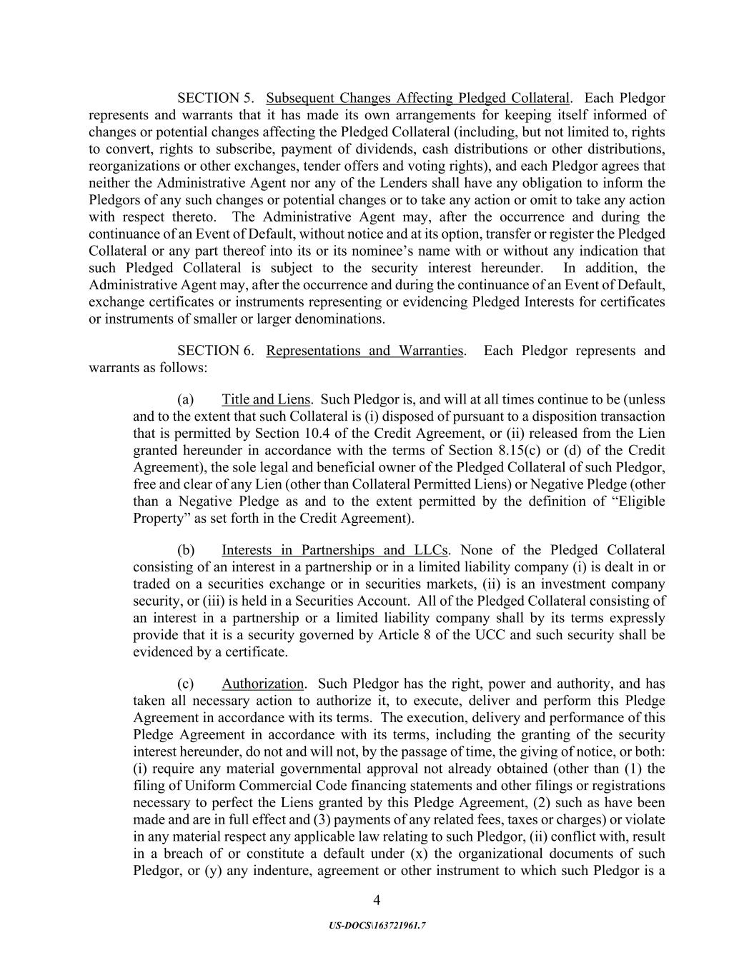 4 US-DOCS\163721961.7 SECTION 5. Subsequent Changes Affecting Pledged Collateral. Each Pledgor represents and warrants that it has made its own arrangements for keeping itself informed of changes or potential changes affecting the Pledged Collateral (including, but not limited to, rights to convert, rights to subscribe, payment of dividends, cash distributions or other distributions, reorganizations or other exchanges, tender offers and voting rights), and each Pledgor agrees that neither the Administrative Agent nor any of the Lenders shall have any obligation to inform the Pledgors of any such changes or potential changes or to take any action or omit to take any action with respect thereto. The Administrative Agent may, after the occurrence and during the continuance of an Event of Default, without notice and at its option, transfer or register the Pledged Collateral or any part thereof into its or its nominee’s name with or without any indication that such Pledged Collateral is subject to the security interest hereunder. In addition, the Administrative Agent may, after the occurrence and during the continuance of an Event of Default, exchange certificates or instruments representing or evidencing Pledged Interests for certificates or instruments of smaller or larger denominations. SECTION 6. Representations and Warranties. Each Pledgor represents and warrants as follows: (a) Title and Liens. Such Pledgor is, and will at all times continue to be (unless and to the extent that such Collateral is (i) disposed of pursuant to a disposition transaction that is permitted by Section 10.4 of the Credit Agreement, or (ii) released from the Lien granted hereunder in accordance with the terms of Section 8.15(c) or (d) of the Credit Agreement), the sole legal and beneficial owner of the Pledged Collateral of such Pledgor, free and clear of any Lien (other than Collateral Permitted Liens) or Negative Pledge (other than a Negative Pledge as and to the extent permitted by the definition of “Eligible Property” as set forth in the Credit Agreement). (b) Interests in Partnerships and LLCs. None of the Pledged Collateral consisting of an interest in a partnership or in a limited liability company (i) is dealt in or traded on a securities exchange or in securities markets, (ii) is an investment company security, or (iii) is held in a Securities Account. All of the Pledged Collateral consisting of an interest in a partnership or a limited liability company shall by its terms expressly provide that it is a security governed by Article 8 of the UCC and such security shall be evidenced by a certificate. (c) Authorization. Such Pledgor has the right, power and authority, and has taken all necessary action to authorize it, to execute, deliver and perform this Pledge Agreement in accordance with its terms. The execution, delivery and performance of this Pledge Agreement in accordance with its terms, including the granting of the security interest hereunder, do not and will not, by the passage of time, the giving of notice, or both: (i) require any material governmental approval not already obtained (other than (1) the filing of Uniform Commercial Code financing statements and other filings or registrations necessary to perfect the Liens granted by this Pledge Agreement, (2) such as have been made and are in full effect and (3) payments of any related fees, taxes or charges) or violate in any material respect any applicable law relating to such Pledgor, (ii) conflict with, result in a breach of or constitute a default under (x) the organizational documents of such Pledgor, or (y) any indenture, agreement or other instrument to which such Pledgor is a
