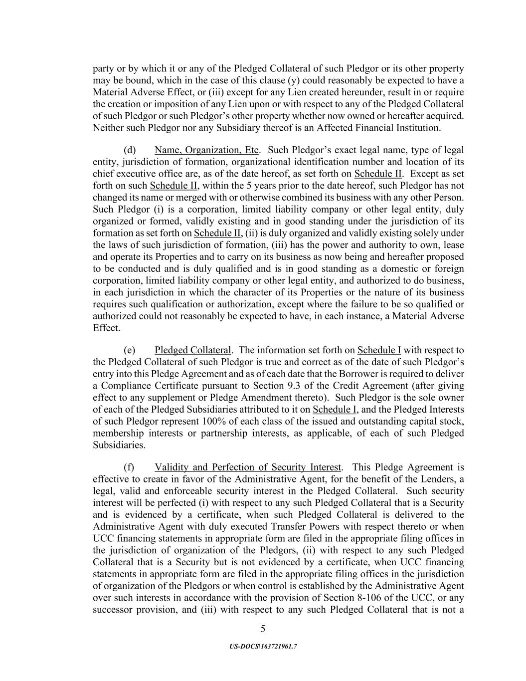 5 US-DOCS\163721961.7 party or by which it or any of the Pledged Collateral of such Pledgor or its other property may be bound, which in the case of this clause (y) could reasonably be expected to have a Material Adverse Effect, or (iii) except for any Lien created hereunder, result in or require the creation or imposition of any Lien upon or with respect to any of the Pledged Collateral of such Pledgor or such Pledgor’s other property whether now owned or hereafter acquired. Neither such Pledgor nor any Subsidiary thereof is an Affected Financial Institution. (d) Name, Organization, Etc. Such Pledgor’s exact legal name, type of legal entity, jurisdiction of formation, organizational identification number and location of its chief executive office are, as of the date hereof, as set forth on Schedule II. Except as set forth on such Schedule II, within the 5 years prior to the date hereof, such Pledgor has not changed its name or merged with or otherwise combined its business with any other Person. Such Pledgor (i) is a corporation, limited liability company or other legal entity, duly organized or formed, validly existing and in good standing under the jurisdiction of its formation as set forth on Schedule II, (ii) is duly organized and validly existing solely under the laws of such jurisdiction of formation, (iii) has the power and authority to own, lease and operate its Properties and to carry on its business as now being and hereafter proposed to be conducted and is duly qualified and is in good standing as a domestic or foreign corporation, limited liability company or other legal entity, and authorized to do business, in each jurisdiction in which the character of its Properties or the nature of its business requires such qualification or authorization, except where the failure to be so qualified or authorized could not reasonably be expected to have, in each instance, a Material Adverse Effect. (e) Pledged Collateral. The information set forth on Schedule I with respect to the Pledged Collateral of such Pledgor is true and correct as of the date of such Pledgor’s entry into this Pledge Agreement and as of each date that the Borrower is required to deliver a Compliance Certificate pursuant to Section 9.3 of the Credit Agreement (after giving effect to any supplement or Pledge Amendment thereto). Such Pledgor is the sole owner of each of the Pledged Subsidiaries attributed to it on Schedule I, and the Pledged Interests of such Pledgor represent 100% of each class of the issued and outstanding capital stock, membership interests or partnership interests, as applicable, of each of such Pledged Subsidiaries. (f) Validity and Perfection of Security Interest. This Pledge Agreement is effective to create in favor of the Administrative Agent, for the benefit of the Lenders, a legal, valid and enforceable security interest in the Pledged Collateral. Such security interest will be perfected (i) with respect to any such Pledged Collateral that is a Security and is evidenced by a certificate, when such Pledged Collateral is delivered to the Administrative Agent with duly executed Transfer Powers with respect thereto or when UCC financing statements in appropriate form are filed in the appropriate filing offices in the jurisdiction of organization of the Pledgors, (ii) with respect to any such Pledged Collateral that is a Security but is not evidenced by a certificate, when UCC financing statements in appropriate form are filed in the appropriate filing offices in the jurisdiction of organization of the Pledgors or when control is established by the Administrative Agent over such interests in accordance with the provision of Section 8-106 of the UCC, or any successor provision, and (iii) with respect to any such Pledged Collateral that is not a